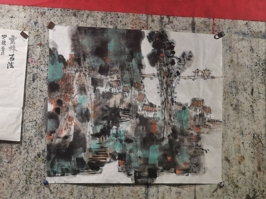 “一幅山水畫的組成,主要元素是石頭、樹、房子、水、小人物。創(chuàng)作時(shí)都能具足這些元素,基本上就能構(gòu)成一幅山水畫!币婚_課,肖加鴻就切入山水畫創(chuàng)作的要點(diǎn)。“所以,要學(xué)山水畫,先從畫石頭開始,然后是樹、房子等,一項(xiàng)項(xiàng)地學(xué)好,山水畫的創(chuàng)作就不難!毙ぜ峪櫖F(xiàn)場(chǎng)演示了石頭的畫法,同時(shí)傳授畫筆用墨的方法:筆要先洗干凈,然后沾點(diǎn)淡墨,再沾濃墨,這樣用筆在宣紙上就有豐富的層次變化。