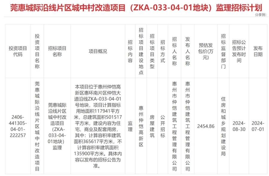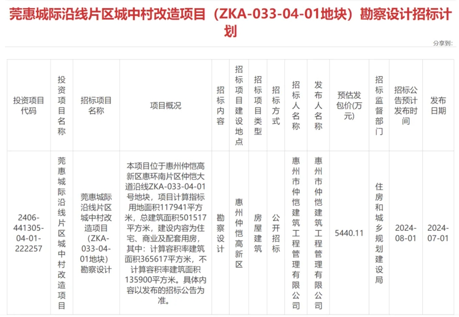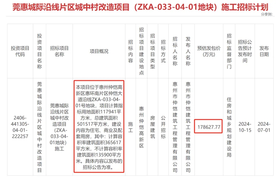 7月1日,據(jù)惠州市公共資源交易中心信息,莞惠城際沿線片區(qū)城中村改造項目(ZKA-033-04-01地塊)發(fā)布施工招標,預計發(fā)包價為178627.77萬元。
