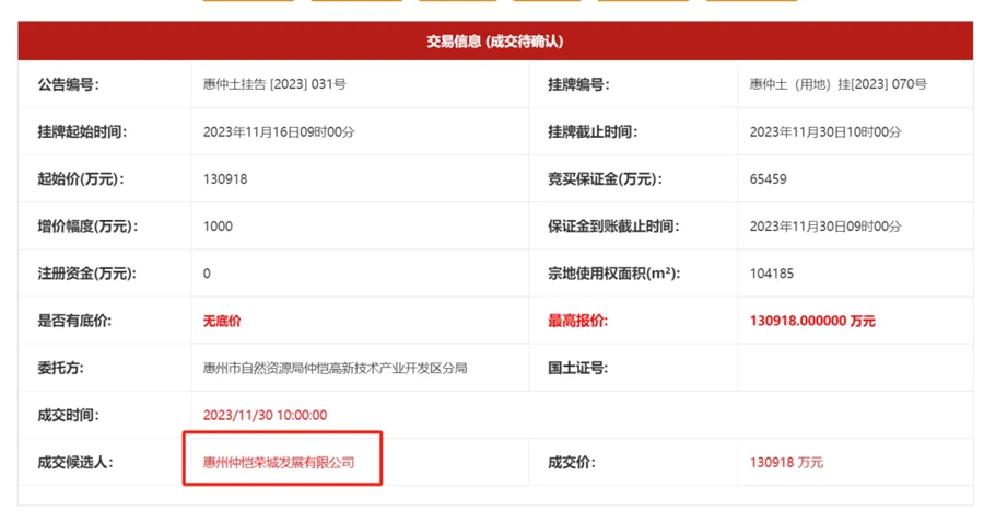 2023年11月30日,地塊再次掛牌,最終被惠州仲愷榮城發(fā)展有限公司以底價130918萬元拿下,折合樓面價3581元/㎡。