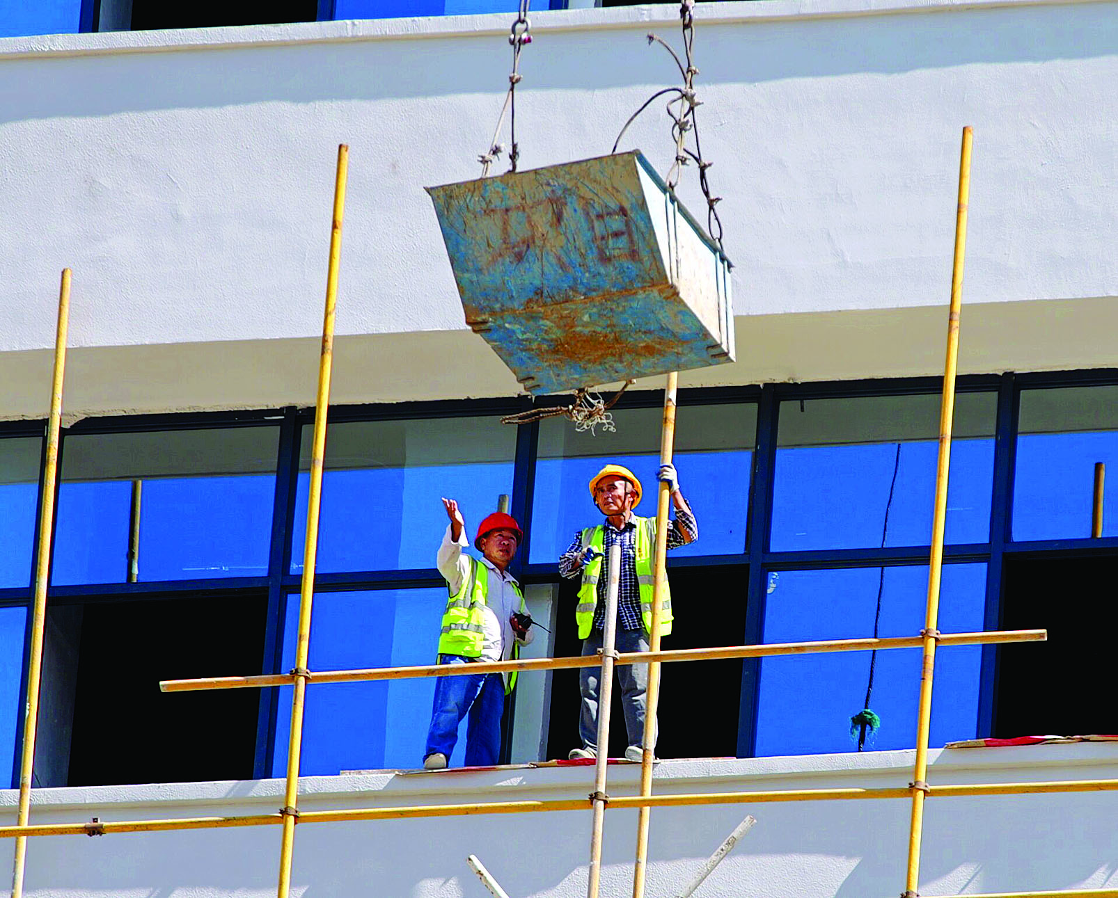 鵝城大橋建設(shè)現(xiàn)場,工人在烈日下澆筑水泥。
