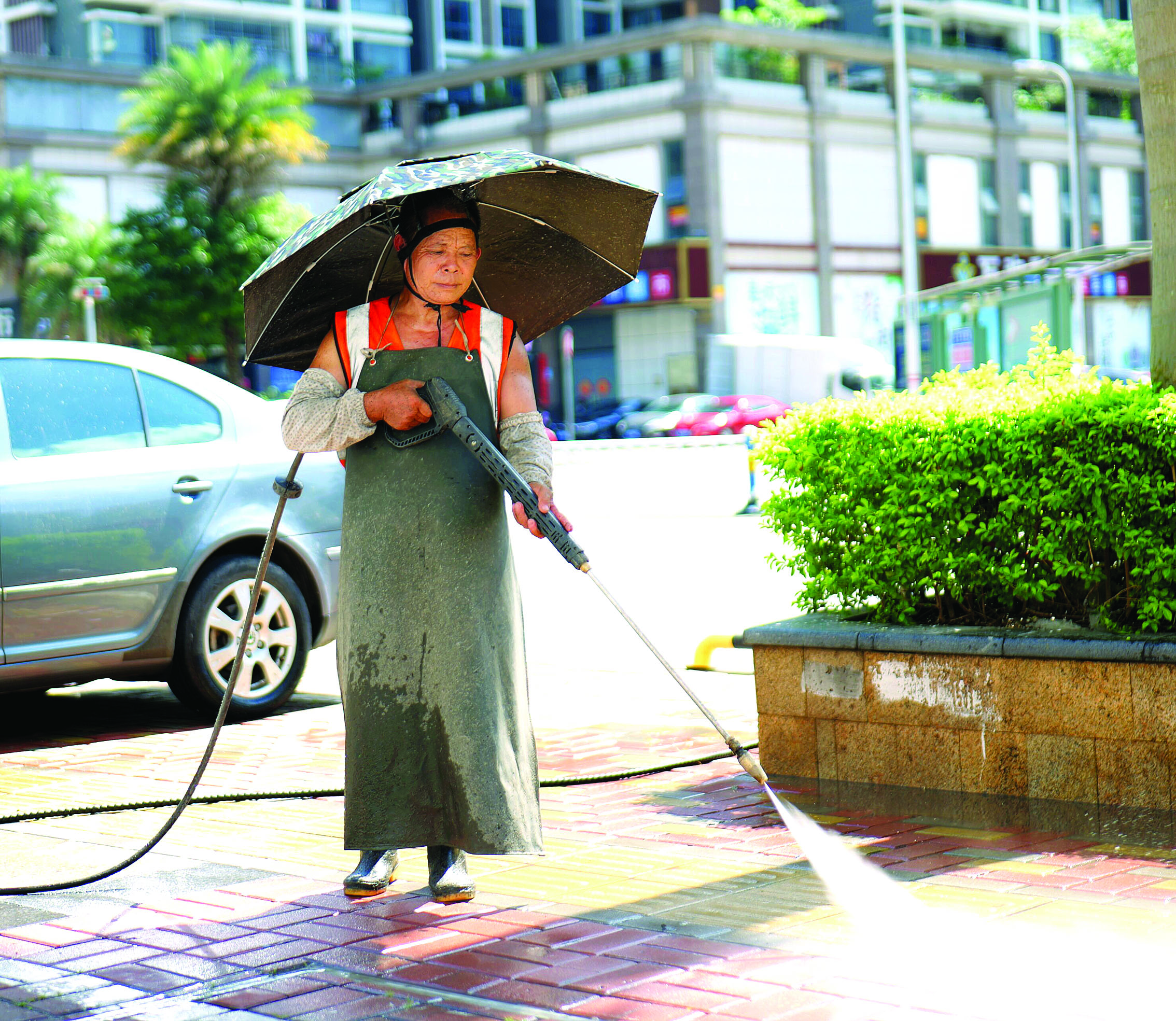環(huán)衛(wèi)工人頂著熱浪清潔人行道。