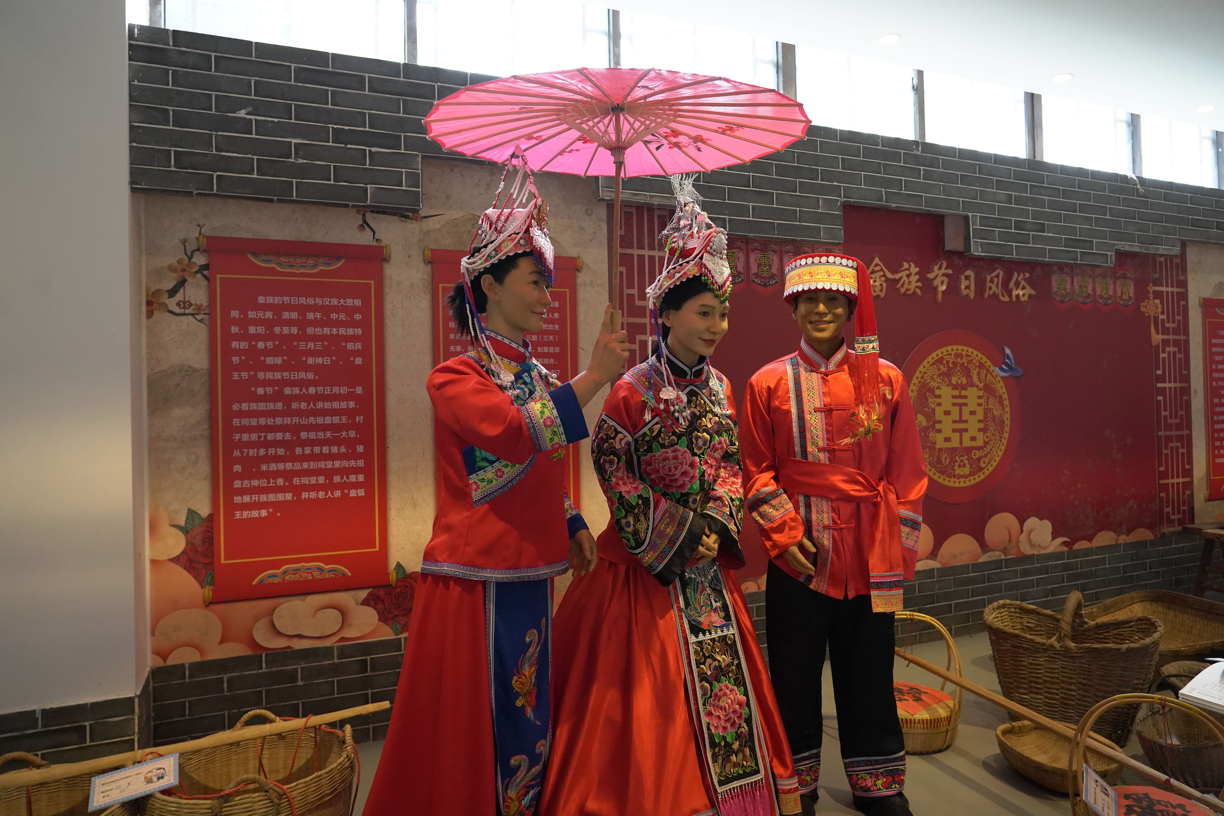 文化傳承館一樓墻面展板旁,穿著畬族新娘新郎和伴娘服飾的3個人體模型笑容滿面,喜慶氛圍感拉滿!靶吕伞边用扁擔(dān)挑著裝滿米和酒的籮格迎親,寓意未來婚姻生活細(xì)水長流。