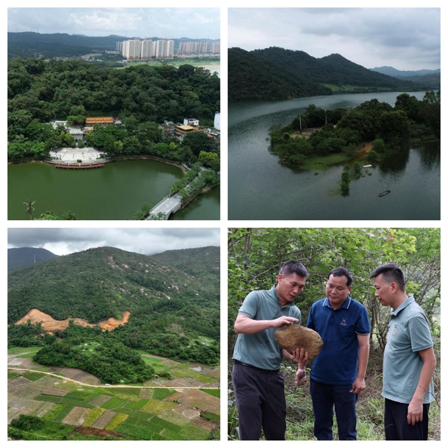 左上:葫蘆嶺貝丘遺址 右上:水東陂水庫(kù) 左下:平海舂碓石遺址 右下:在水東陂林場(chǎng)發(fā)現(xiàn)疑似“砍砸器”的石頭。