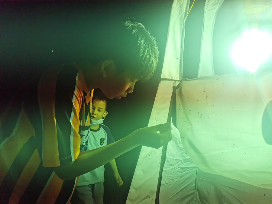 仲夏夜,一輪明月高高掛起,在惠陽(yáng)秋長(zhǎng)周田村一處山谷邊,周?chē)粫r(shí)響起蟲(chóng)鳴聲。微風(fēng)輕輕吹來(lái),幾個(gè)大人坐在山坡上乘涼。不遠(yuǎn)處,幾個(gè)小學(xué)生正安靜地守候在昆蟲(chóng)燈誘帳篷旁邊,看著各種小昆蟲(chóng)飛入帳篷里。突然,人群中爆發(fā)出一聲呼喊,一個(gè)男孩抓起一只昆蟲(chóng)小心翼翼放在手里,如獲珍寶。大家紛紛圍上去,嘰嘰喳喳討論著。鄉(xiāng)村寂靜的夜晚,一下子就熱鬧了起來(lái)。