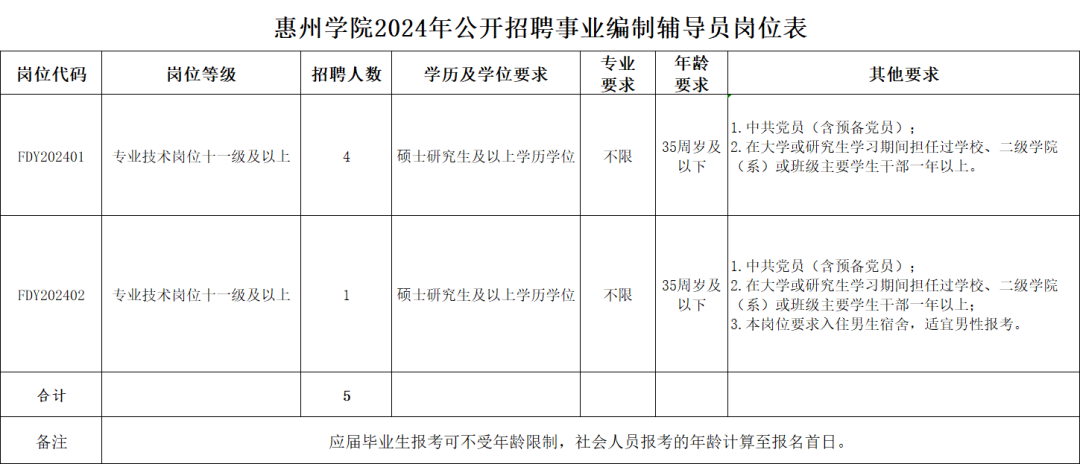 7.具備報(bào)考崗位所需的其他條件,詳見(jiàn)附件《惠州學(xué)院2024年公開(kāi)招聘事業(yè)編制輔導(dǎo)員崗位表》。