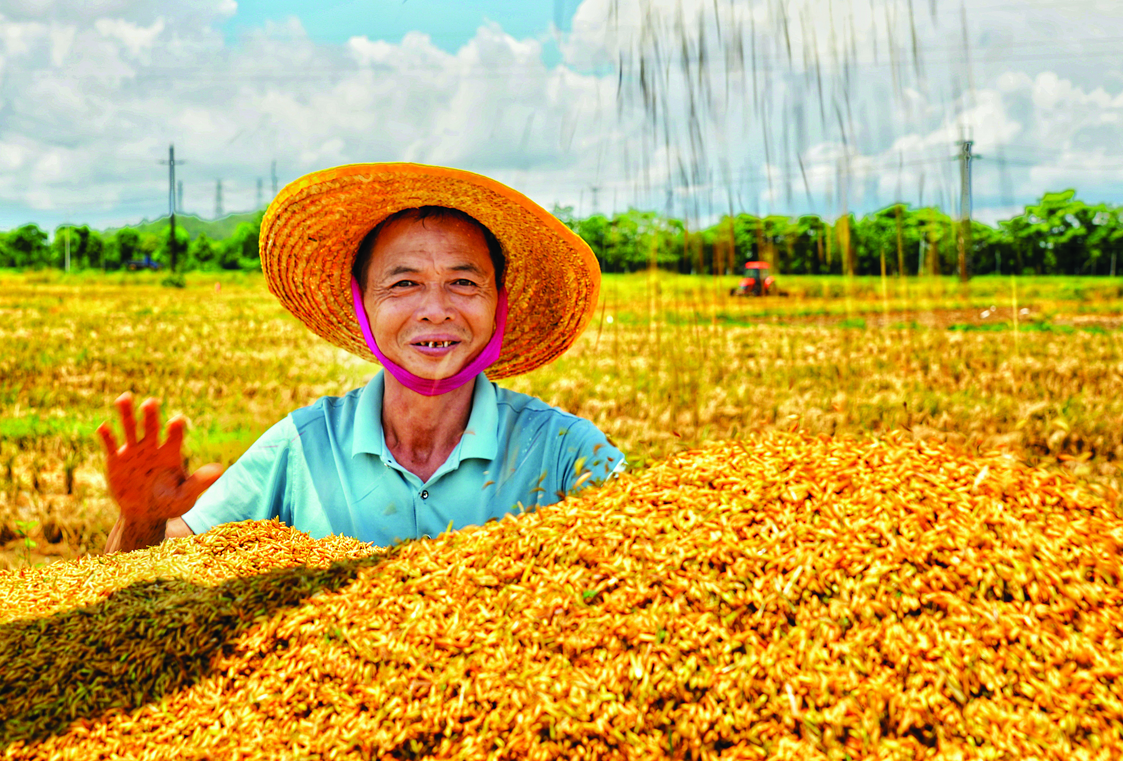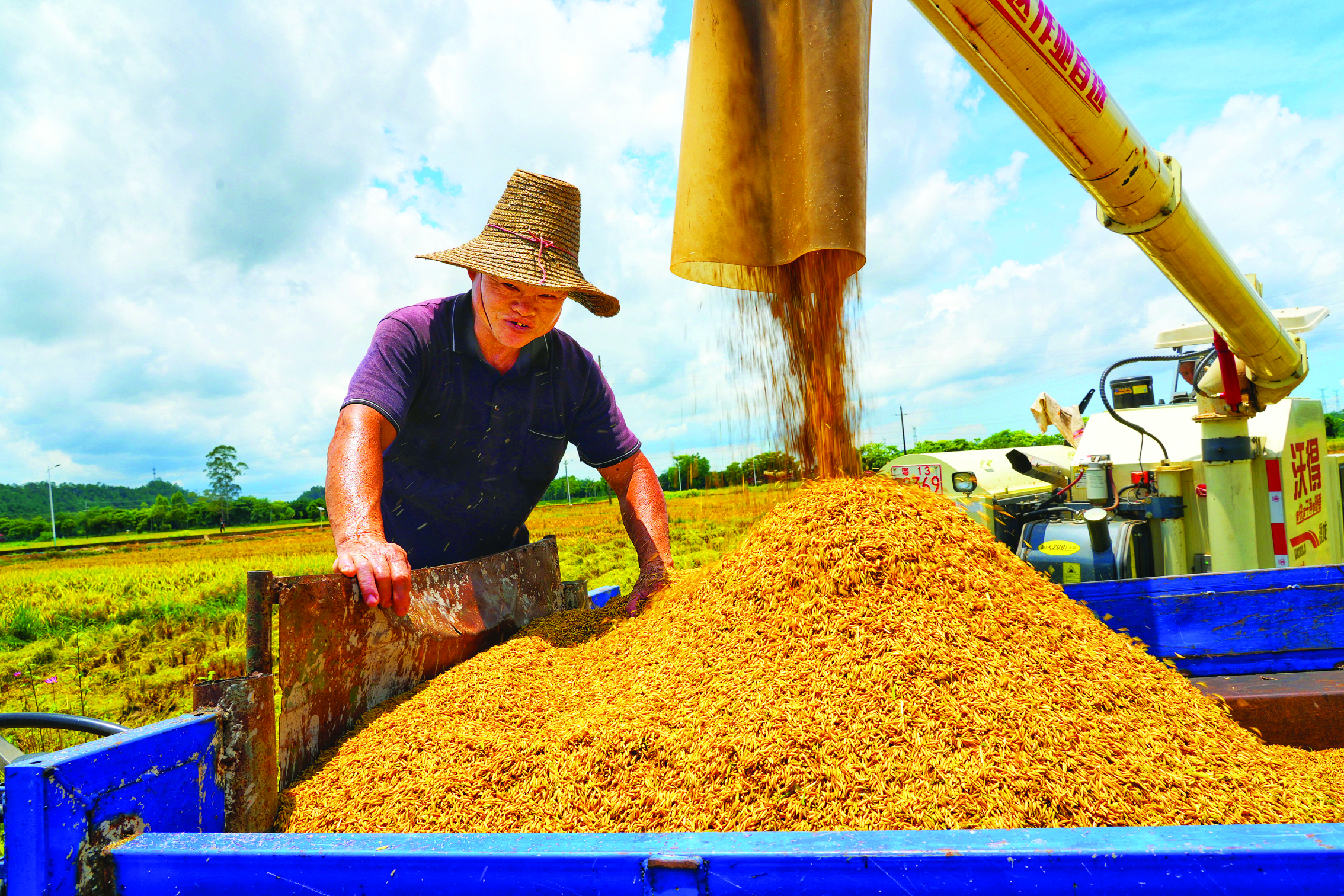 顆粒飽滿的稻谷裝滿了運(yùn)輸車輛。