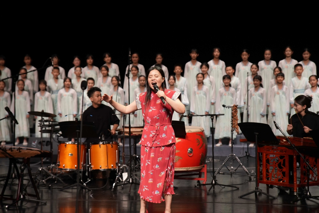 音樂(lè)會(huì)每到一城,龔琳娜都會(huì)與當(dāng)?shù)貎和铣獔F(tuán)合作。本次來(lái)到惠州,龔琳娜與惠州市第十一小學(xué)金榜分校合唱團(tuán)合作了《木瓜》《夢(mèng)想號(hào)子》,其中《木瓜》選自《詩(shī)經(jīng)·衛(wèi)風(fēng)》。“很多地方的兒童合唱團(tuán)都是通過(guò)青少年宮精挑細(xì)選后組成的,沒(méi)想到惠州一所小學(xué)有這么多優(yōu)秀的孩子,不但音準(zhǔn)節(jié)奏好,精氣神也很飽滿(mǎn)。我希望孩子們?cè)谂_(tái)上演唱《詩(shī)經(jīng)》的時(shí)候,能夠?qū)鹘y(tǒng)文化保持一種自豪感,這樣他們以后再去學(xué)古詩(shī)詞,再去了解我們的民歌,就不會(huì)覺(jué)得很遙遠(yuǎn)了。”龔琳娜說(shuō)。