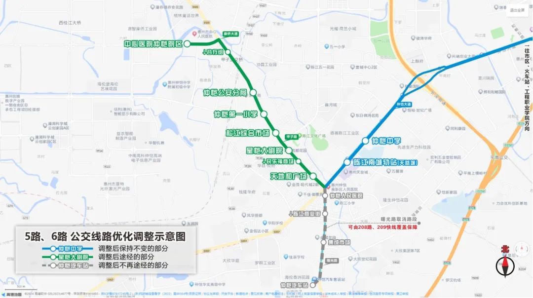 線路調(diào)整:取消5路仲愷人民醫(yī)院、陳江商業(yè)街、集成市場、仲愷汽車站等4個站點,改由曙光路口延伸經(jīng)甲子路、康僑大道至中心醫(yī)院仲愷院區(qū)。