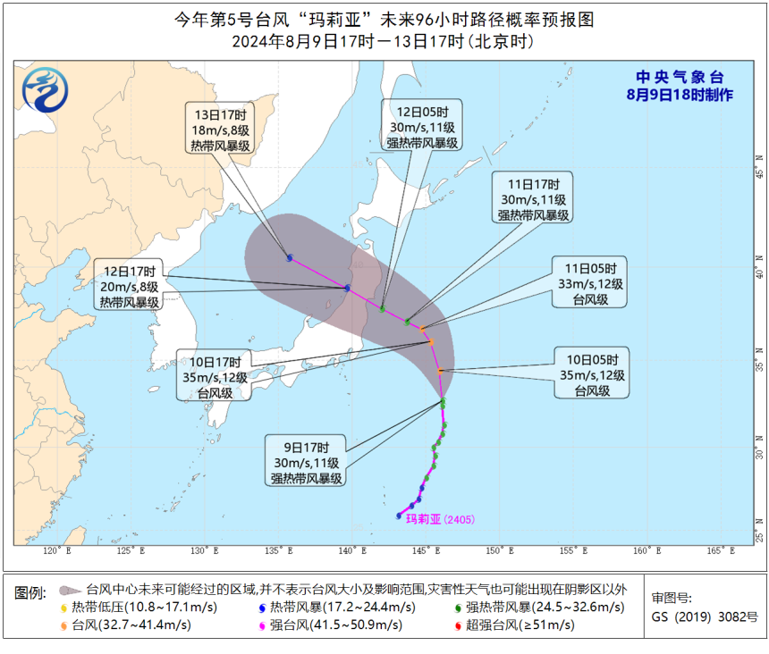 今年第5號(hào)臺(tái)風(fēng)“瑪莉亞”的中心8月9日上午11時(shí)位于距離日本東京東南方向約780公里,中心附近最大風(fēng)力11級(jí)(30米/秒),中心最低氣壓975百帕。