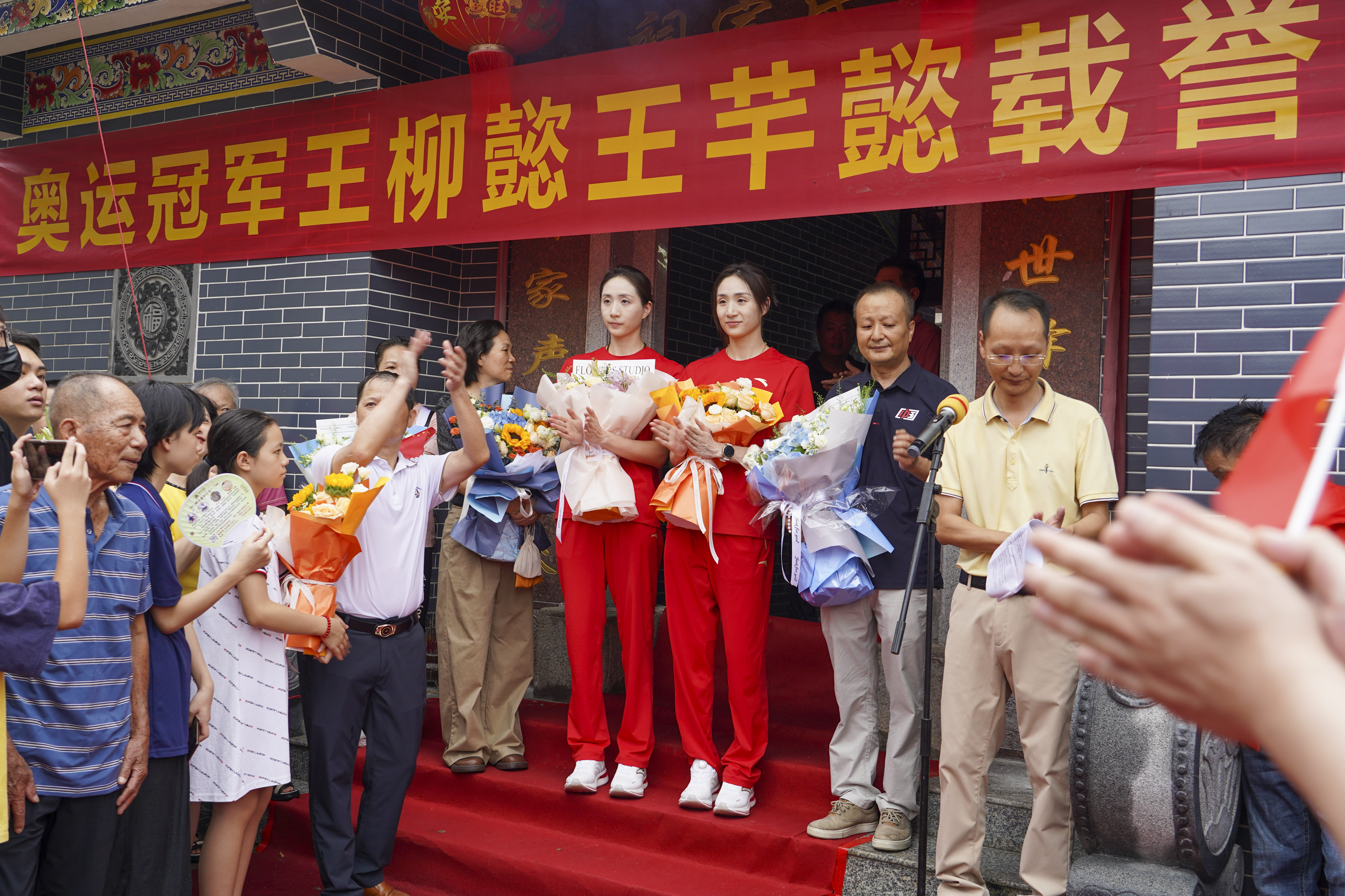 8月18日上午,奧運雙冠花游姐妹王柳懿、王芊懿結束2024年巴黎奧運會征程后,載譽回到祖籍地惠城區(qū)汝湖蝦村祭祖,與父老鄉(xiāng)親共敘家鄉(xiāng)情;莩菂^(qū)、汝湖鎮(zhèn)相關負責人到場祝賀。