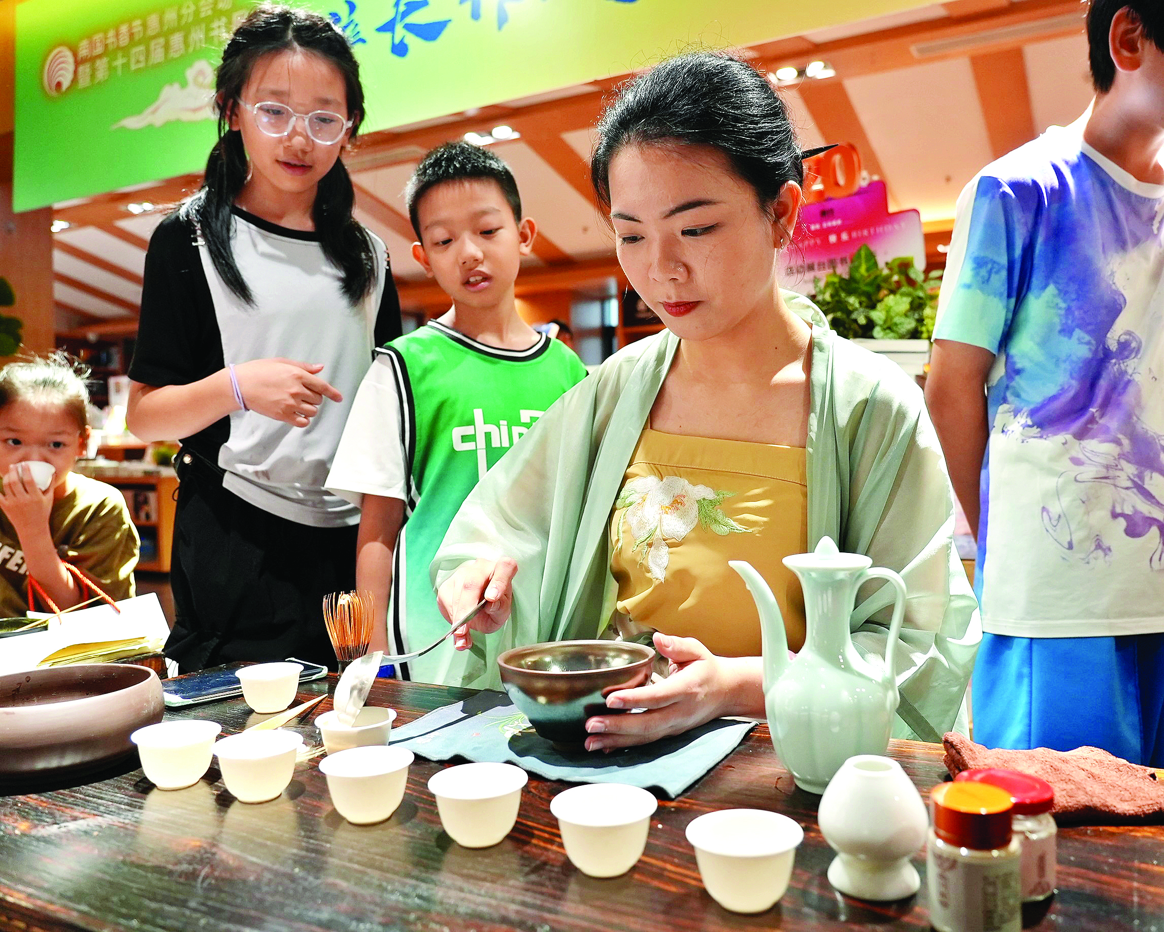 “小朋友,你是想在茶上畫畫還是寫字?”點茶席位一旁,茶百戲小攤位也備受市民喜愛——像咖啡拉花一樣,在茶湯上畫出豐富多變的圖案。