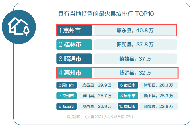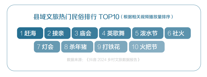 縣城和鄉(xiāng)村,在與平臺(tái)進(jìn)行合作的基礎(chǔ)上,依靠自身特色的民俗文化、特色美食以及生活方式等,吸引眾多網(wǎng)友種草和打卡,成為了城市之外具有獨(dú)特吸引力的旅游目的地。趕海、接親、英歌舞等熱門民俗成為縣域文化出圈的方式。例如,2024年春節(jié),抖音“英歌舞”相關(guān)話題播放量超45億次。