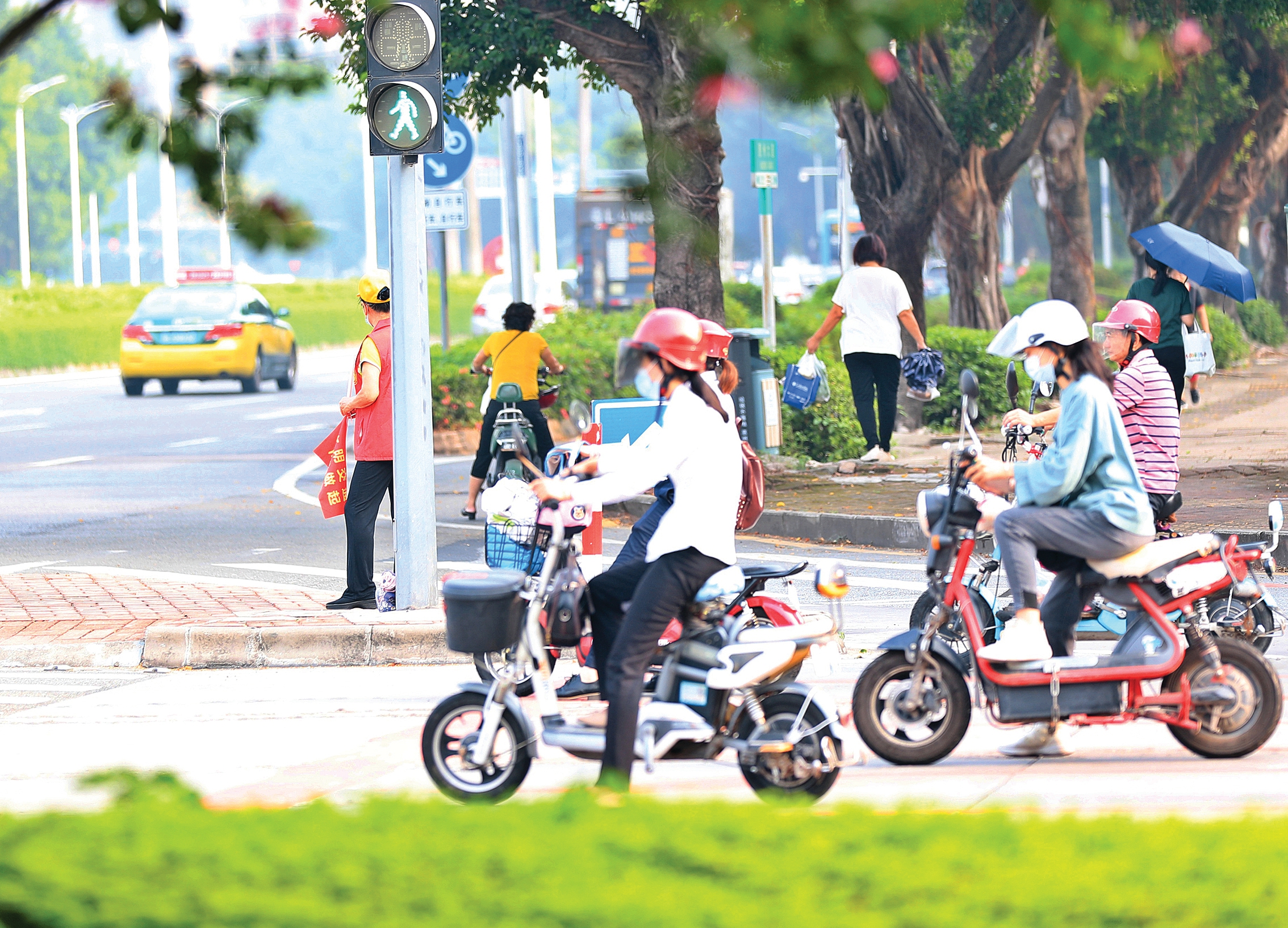 騎電動(dòng)自行車的市民在等紅綠燈。惠州東江圖片社供圖