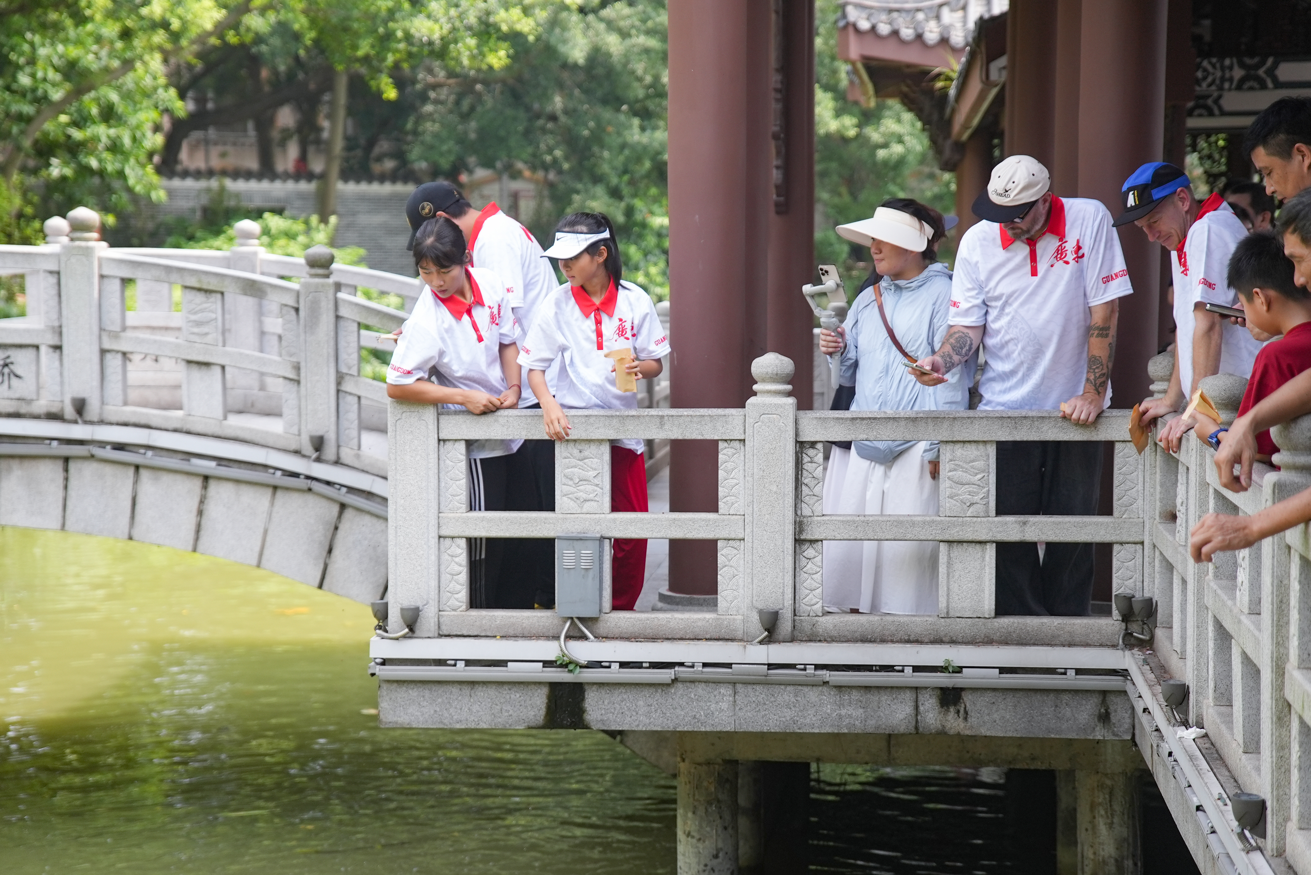 奧運(yùn)健兒們?cè)谪S渚園喂魚(yú)。惠州日?qǐng)?bào)記者羅劍業(yè) 攝