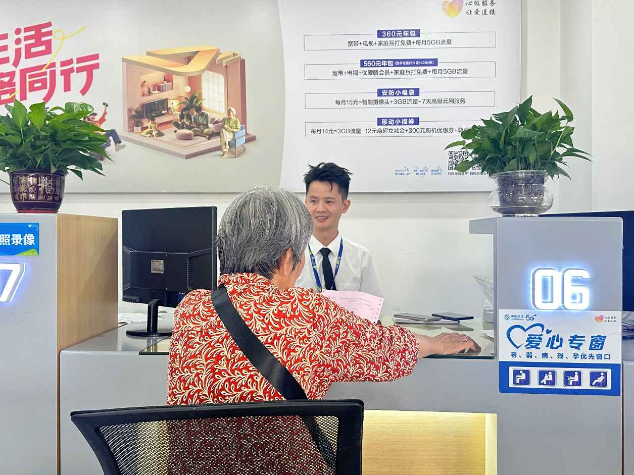 廣東移動(dòng)惠州惠城分公司在營(yíng)業(yè)廳設(shè)置“愛(ài)心專(zhuān)窗”,為老、弱、病、殘、孕等特殊群體開(kāi)通“綠色通道”。