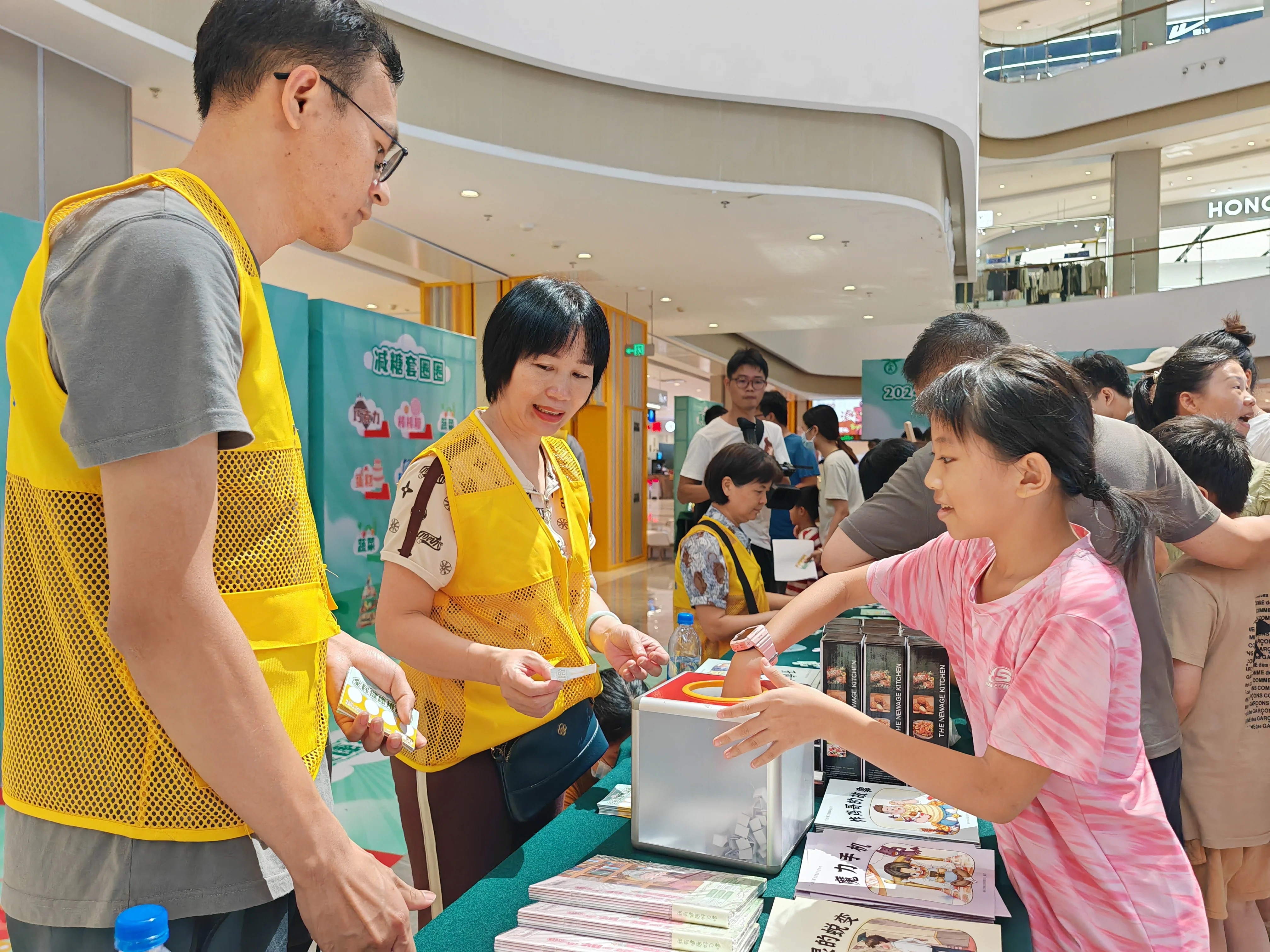 在設(shè)置的各主題攤位前,放置有油壺、限鹽勺、BMI腰圍尺、膳食寶塔冰箱貼、主題紙巾盒和折扇等健康小助手;現(xiàn)場(chǎng)發(fā)放的“三減三健”漫畫涂鴉套裝和科普繪本,利用主題涂鴉和漫畫故事倡導(dǎo)健康,深受家長(zhǎng)和孩子歡迎。此外,口腔義診、健康宣傳、有獎(jiǎng)知識(shí)問答等環(huán)節(jié)也受到廣泛好評(píng)。