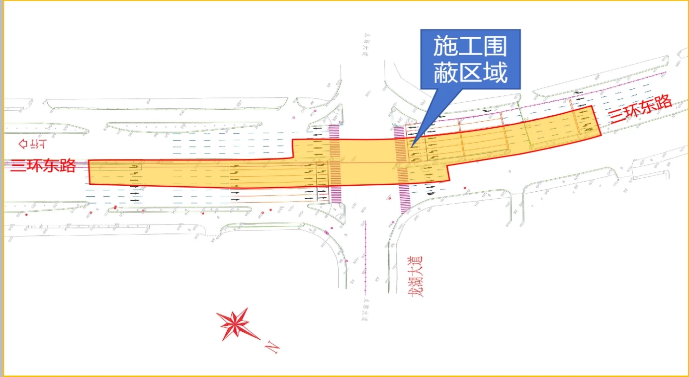 施工期間,三環(huán)東路/龍湖大道交叉口東西向保留1條人行橫道,行人可通過該人行橫道按交通信號燈指示通行。