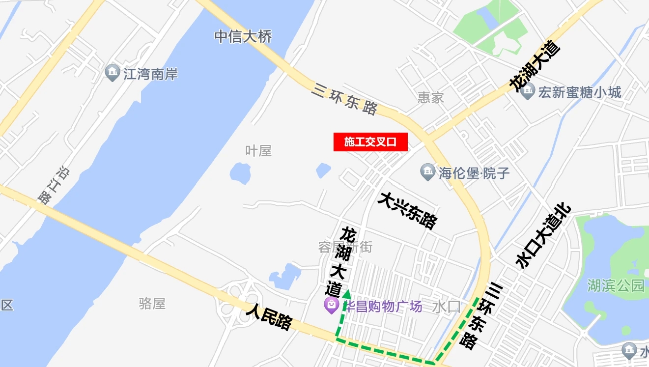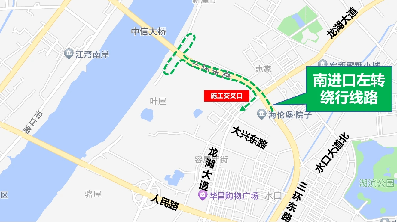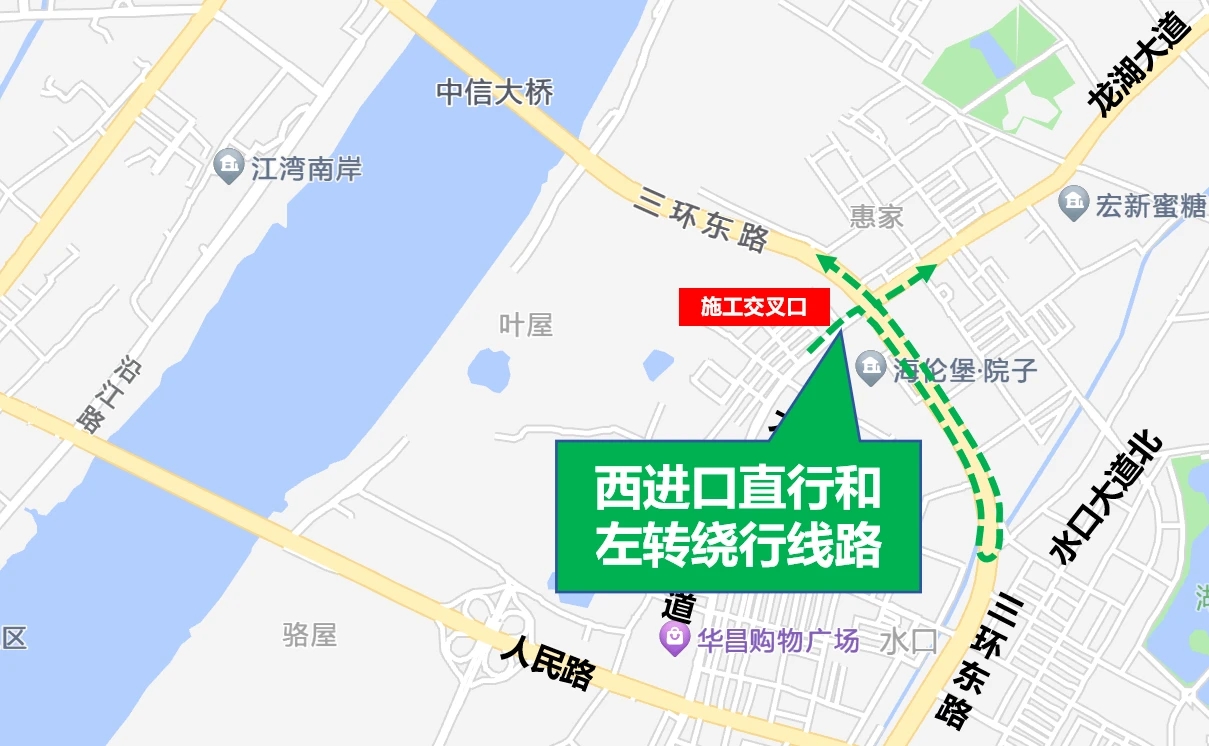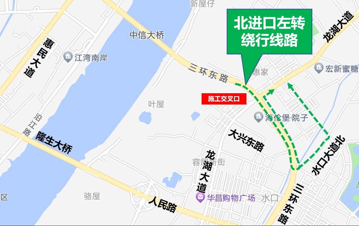 第二階段施工期間,原從東進口直行、南進口左轉、北進口右轉的車輛,請通過三環(huán)東路/惠澤大道交叉口-人民路-龍湖大道等道路繞行,其余方向按照施工第一階段進行繞行。
