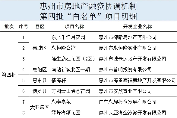 9月5日,惠州市房地產(chǎn)融資協(xié)調(diào)機(jī)制工作專班推送第四批“白名單”項目,永恒隆公館、永泰嘉苑等8個項目被列入。