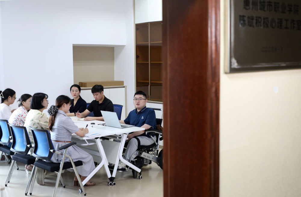 陳斌在積極心理工作室與教師探討。新華社記者 黃國保 攝