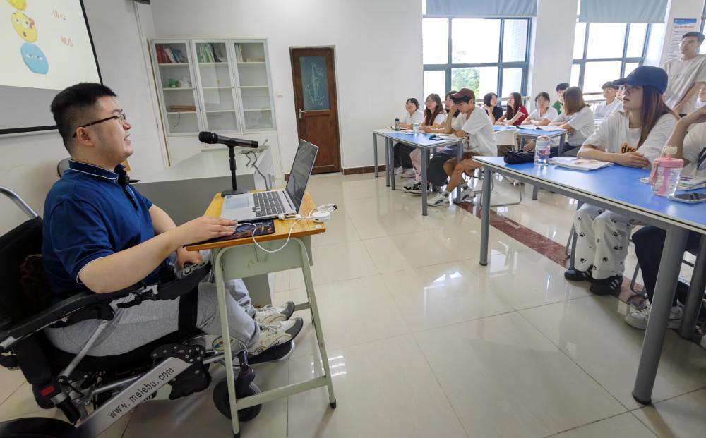 第一次面對學(xué)生,陳斌緊張了。坐在輪椅上的他,肢體語言不豐富,只能用實(shí)際內(nèi)容和口頭語言來吸引學(xué)生。