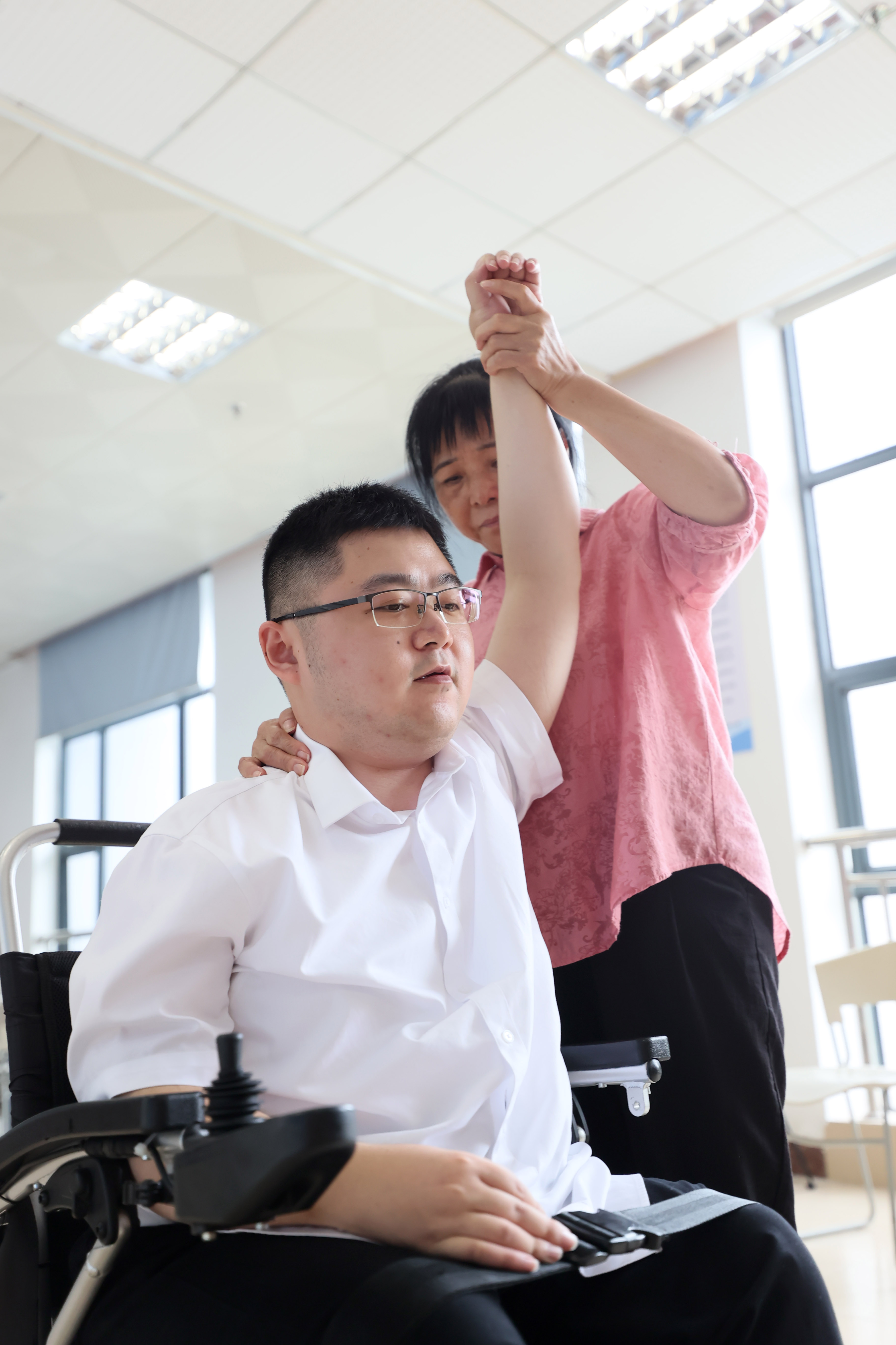 2024年9月6日,歇息時(shí)間,李惠云為兒子按摩,緩解陳斌手腳長(zhǎng)時(shí)間不動(dòng)的情況。