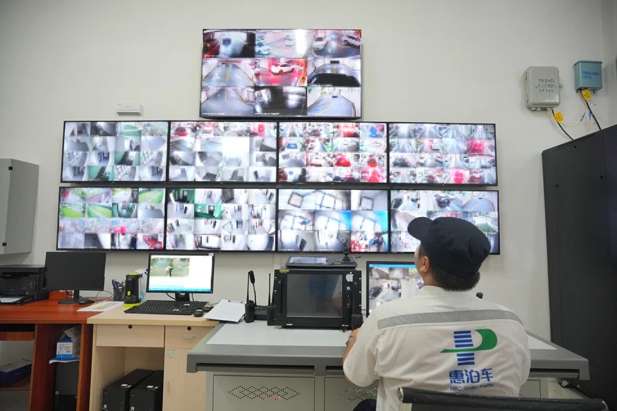 工作人員使用高清監(jiān)控對停車場車輛進(jìn)行引導(dǎo)管理。