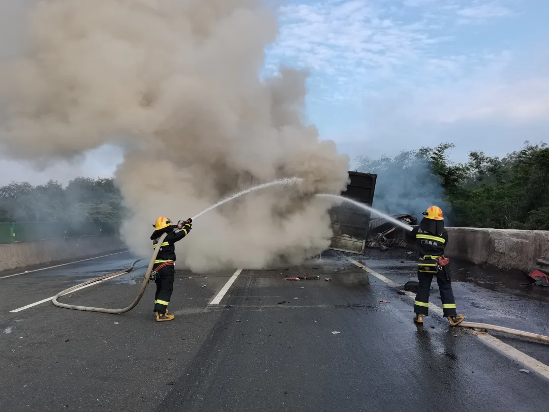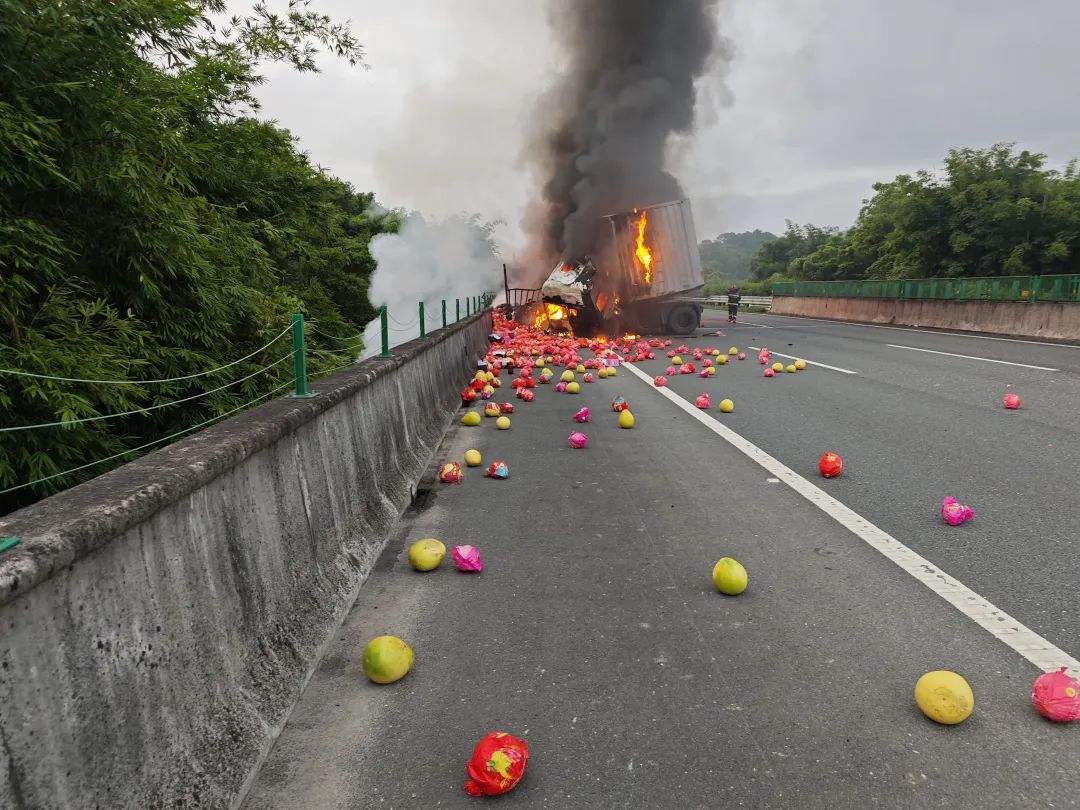 由于兩車相撞起火,貨物正猛烈燃燒,