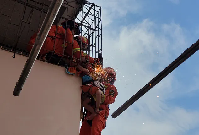 現(xiàn)場(chǎng)消防員先對(duì)小孩進(jìn)行固定保護(hù),隨后在小孩旁邊的位置進(jìn)行破拆防護(hù)窗。為防止小孩在破拆作業(yè)時(shí)被燙傷,救援人員一邊灑水進(jìn)行降溫,一邊使用毛巾為小孩抵擋濺射的火星。經(jīng)過近20分鐘的緊急救援,小孩成功脫困。