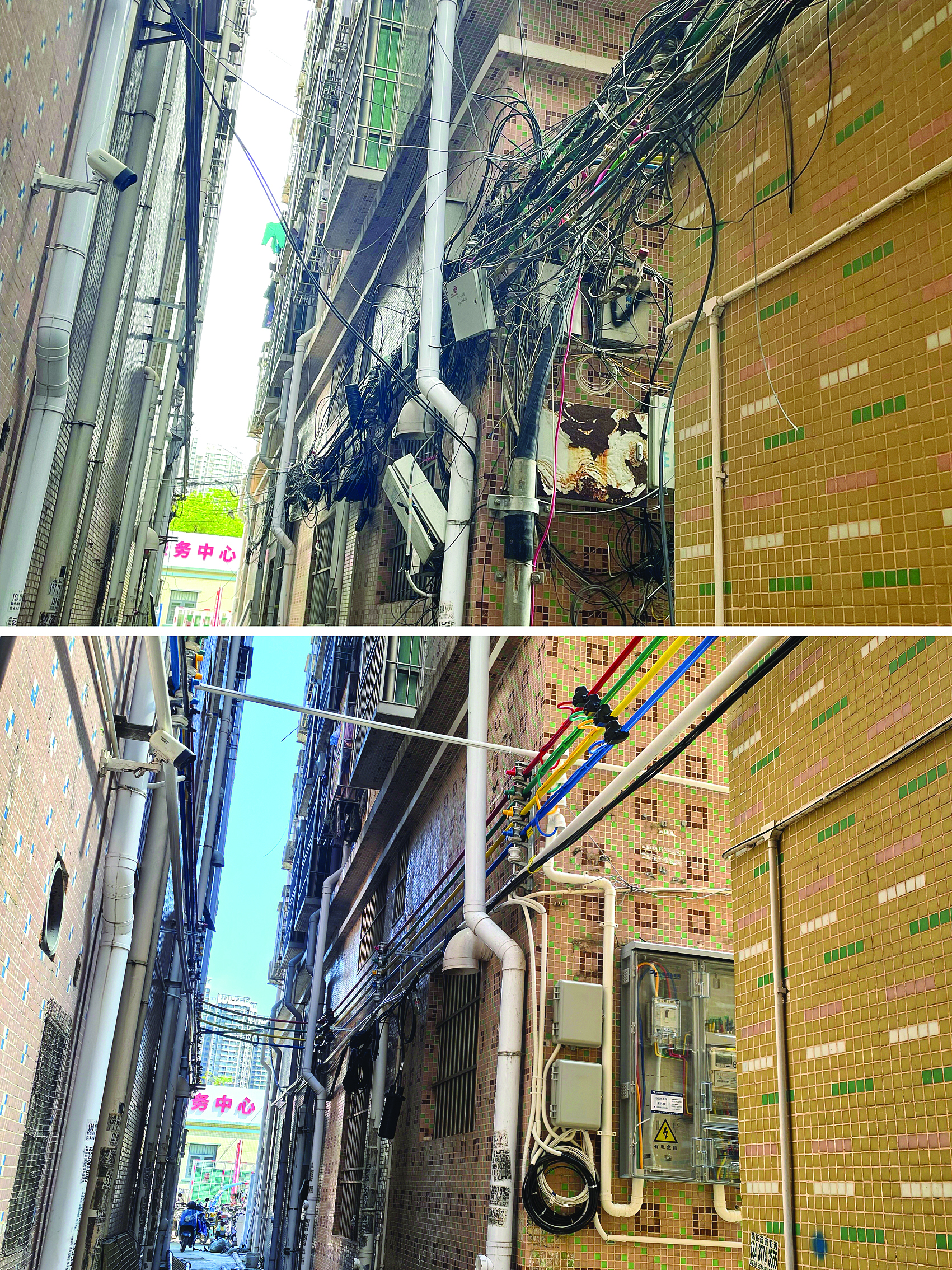 然而,隨著經(jīng)濟(jì)社會(huì)的發(fā)展,“三線”亂拉掛問(wèn)題日趨凸顯。原來(lái),新寮村的房屋是典型的“城中村”自建房,早期由于缺乏系統(tǒng)規(guī)劃,村內(nèi)電力線、通信線、廣播電視線等線路相互交織,入戶線路雜亂無(wú)章,導(dǎo)致村居房前屋后“蜘蛛網(wǎng)”叢生,不僅嚴(yán)重影響村容村貌,也存在一定的安全隱患。