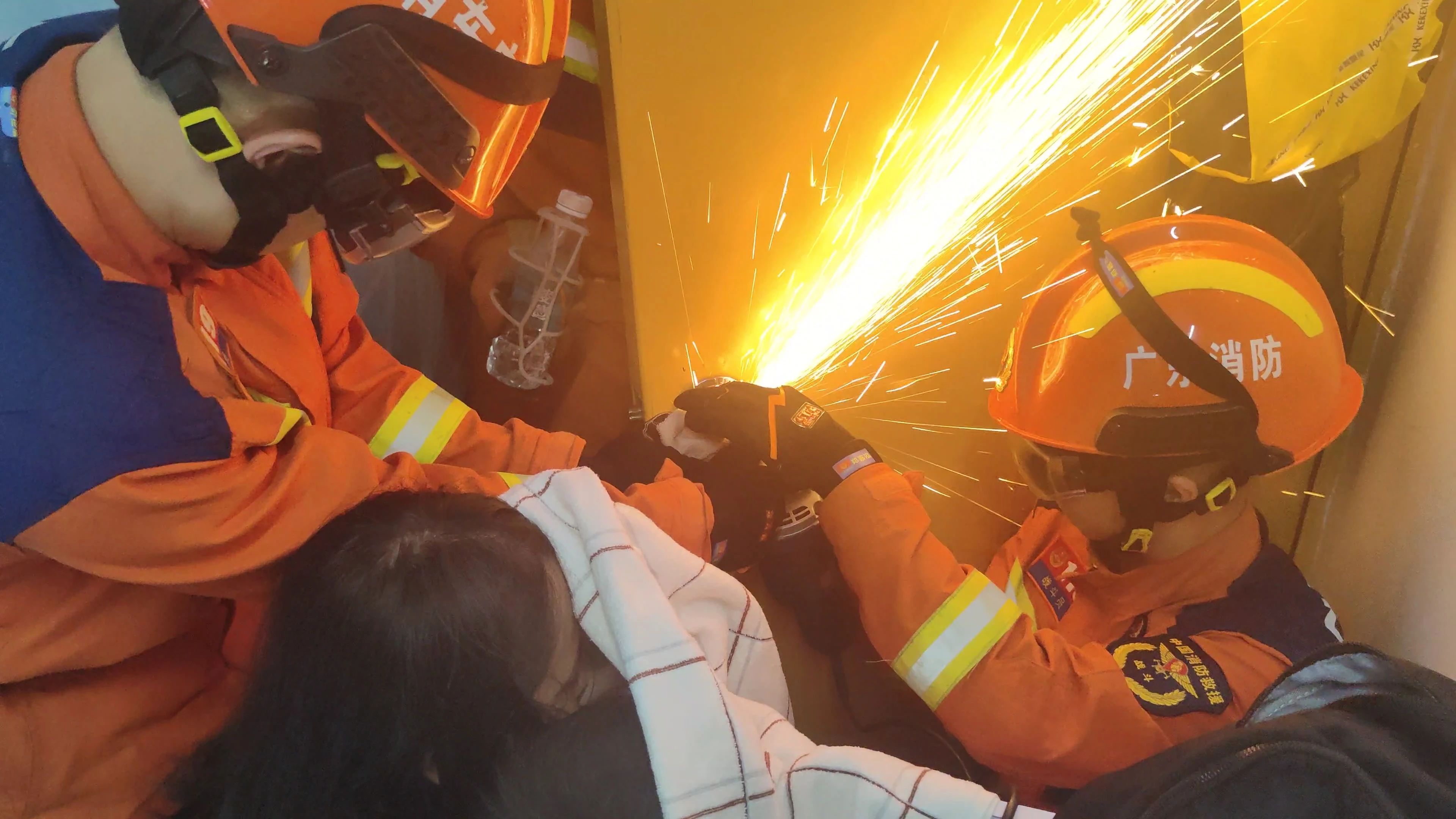為了防止小孩與其母親在破拆作業(yè)時(shí)被燙傷,救援人員一邊灑水進(jìn)行降溫,一邊使用毛巾為小孩抵擋濺射的火星。