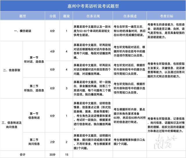 近日,惠州市教育局制定的《惠州市初中學(xué)業(yè)水平考試英語聽說考試工作方案(試行)》印發(fā)。記者從中了解到,自2025年起,惠州中考實施英語聽說考試。2025-2026年為政策過渡期,中考英語聽說考試不收費。2027年起正式實施后,收費按有關(guān)規(guī)定執(zhí)行。