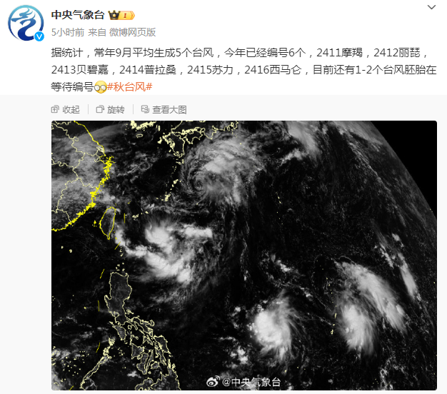 據(jù)@中央氣象臺(tái)消息,據(jù)統(tǒng)計(jì),常年9月平均生成5個(gè)臺(tái)風(fēng),今年已經(jīng)編號(hào)6個(gè),2411“摩羯”,2412“麗琵”,2413“貝碧嘉”,2414“普拉!,2415“蘇力”,2416“西馬侖”,目前還有1~2個(gè)臺(tái)風(fēng)胚胎在等待編號(hào)。