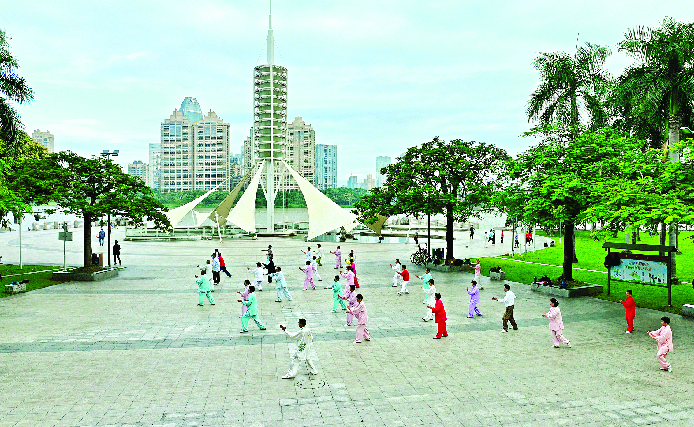 市民在市區(qū)東江沙公園打太極拳;葜萑請笥浾哏姇承 攝