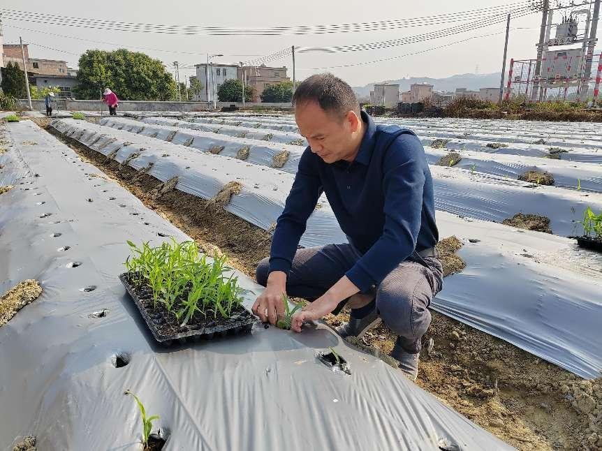 駐村干部第一批駐鎮(zhèn)幫鎮(zhèn)扶村隊(duì)員曾傳聲在鮮食玉米種植基地插下秧苗。