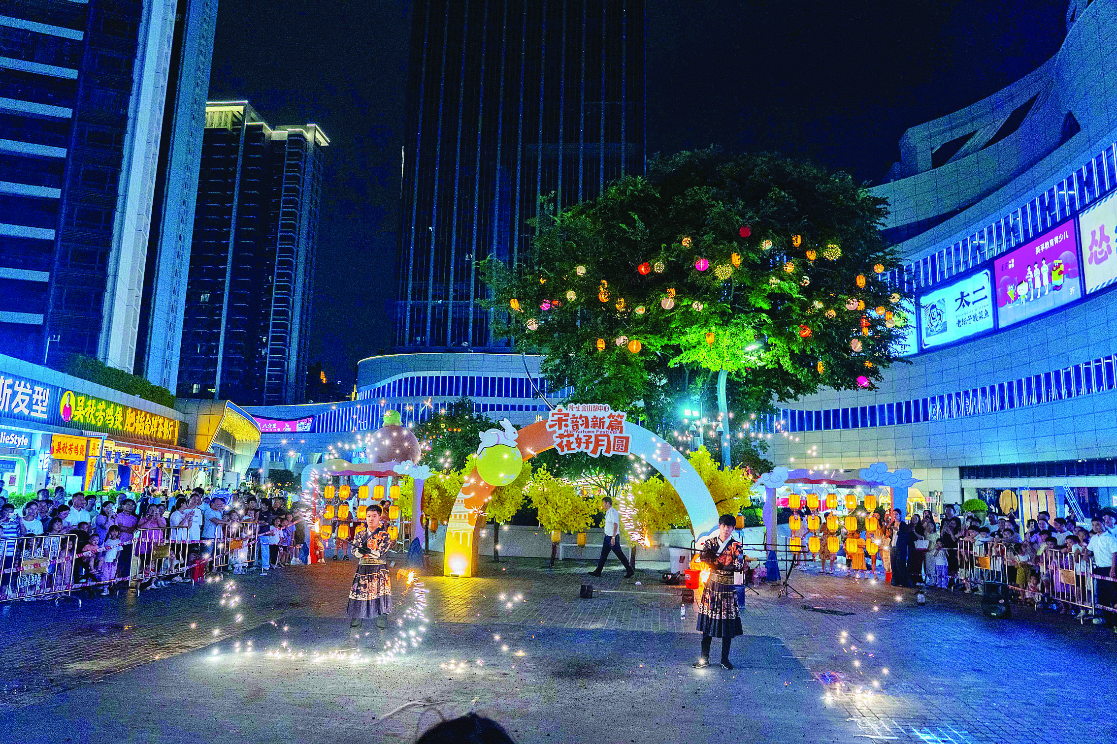 商圈的火壺表演吸引了眾多消費(fèi)者圍觀;葜萑?qǐng)?bào)記者劉煒煒 攝