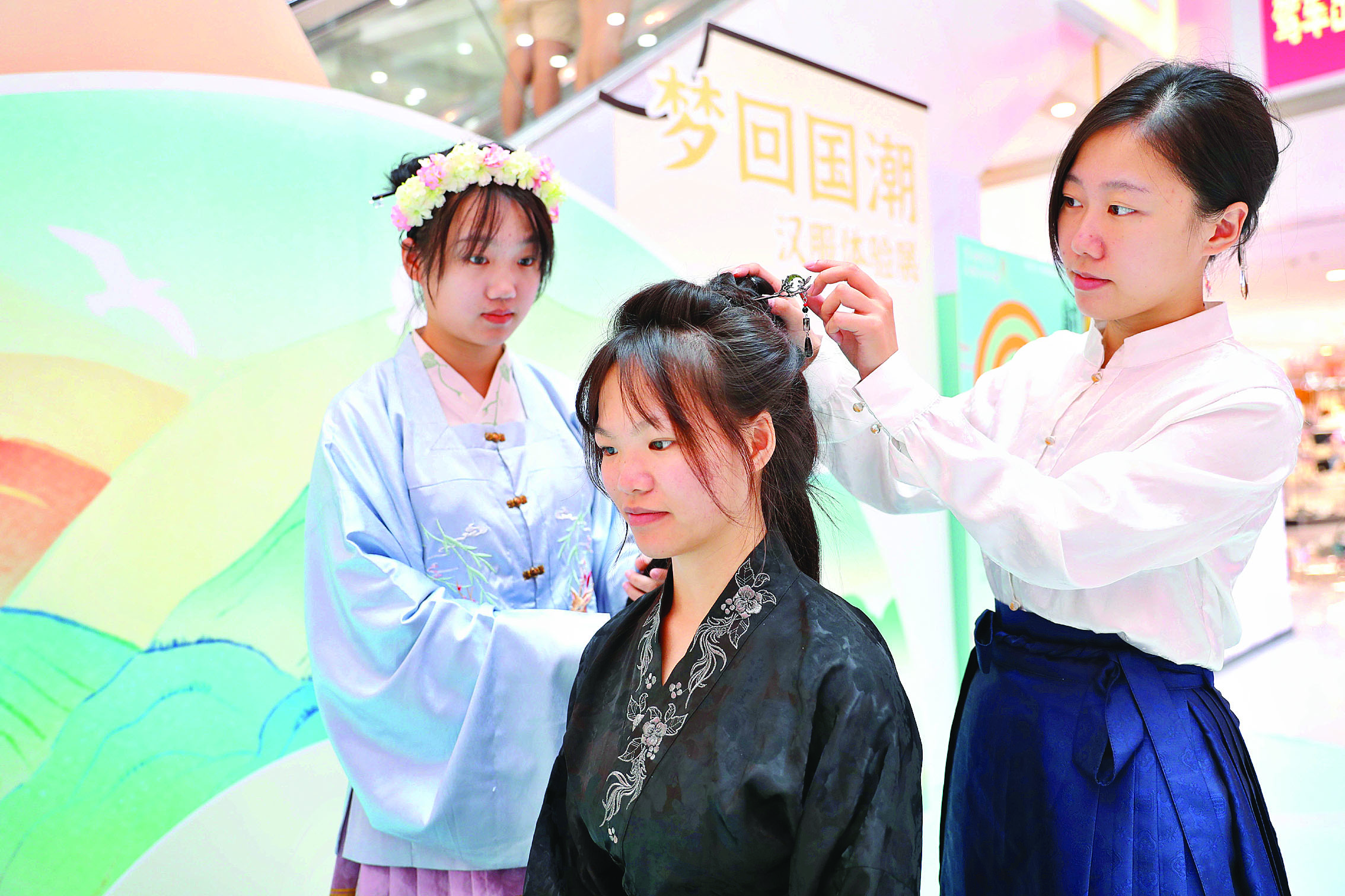10月4日上午10時(shí)許,在麗日購物廣場(chǎng)(西湖店),廖靜怡和小伙伴們忙個(gè)不停,她不時(shí)為前來體驗(yàn)漢服的市民化妝盤發(fā),不時(shí)向市民解說漢服史,盡管忙碌,但樂此不疲。
