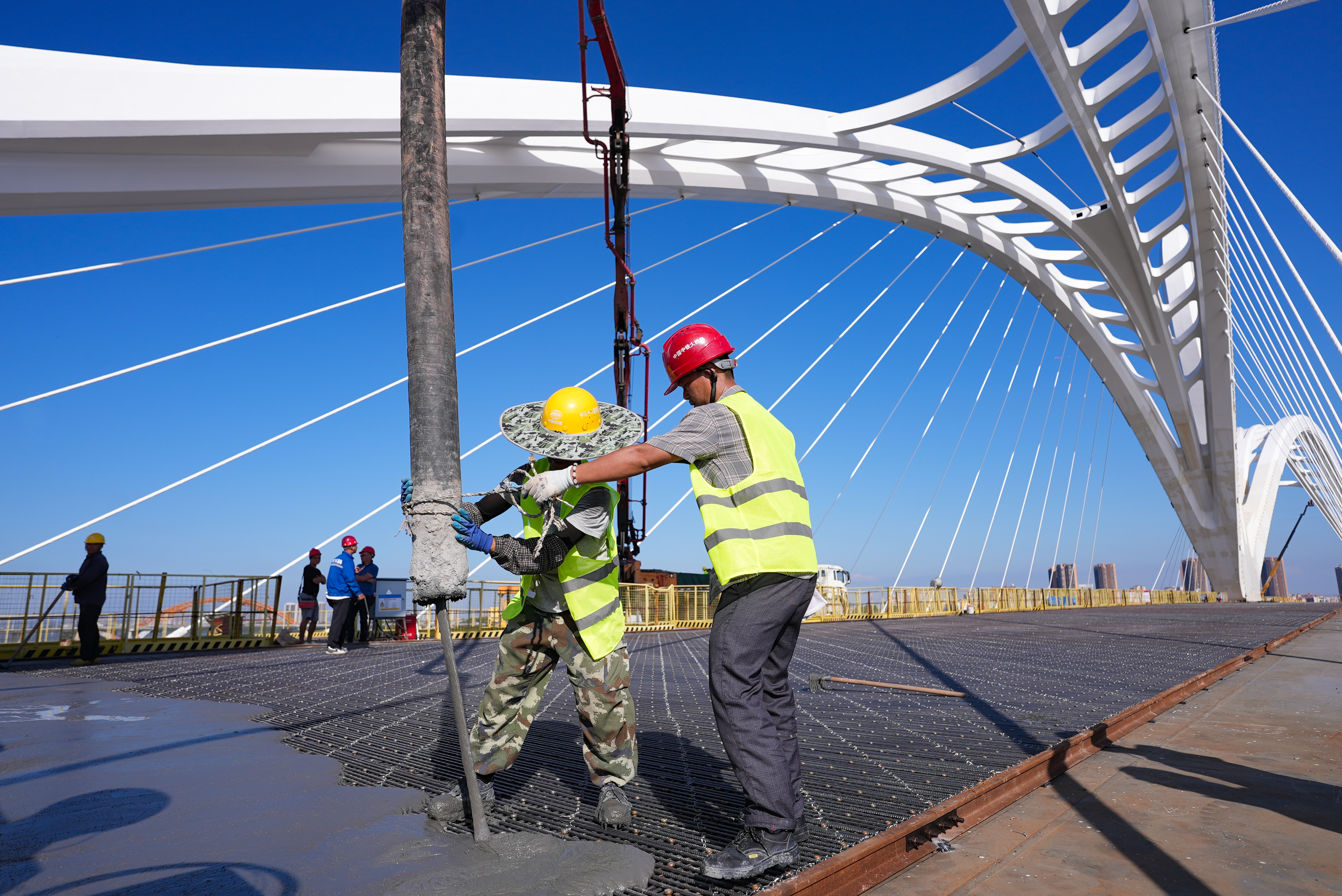 國慶假期,鵝城大橋的建筑工人正在緊鑼密鼓地作業(yè)。