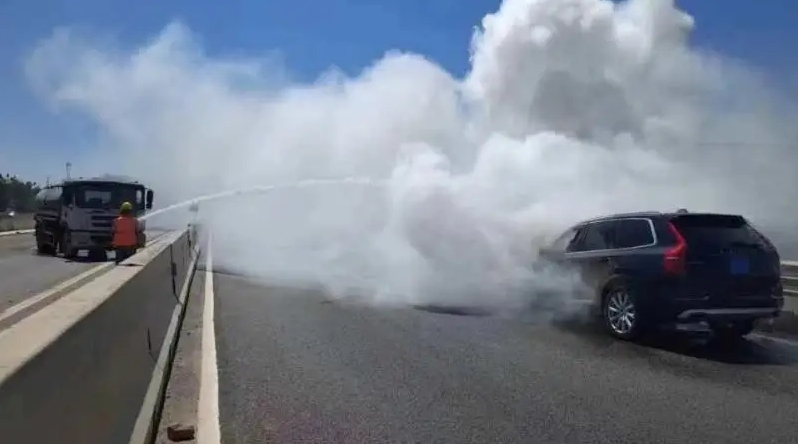 面對這一突發(fā)狀況,惠河高速監(jiān)控中心第一時間通知轄區(qū)交警、路政部門以及消防、拯救等單位,同時通知鄰近楊村站、麻陂站入口做好車輛繞行指引。轄區(qū)楊村路政中隊接報后,立即啟動聯(lián)勤聯(lián)動機制,在車流量大且封閉路肩的情況下,跑步趕往現(xiàn)場處置。到達現(xiàn)場后,路政員看到小車車頭已經(jīng)燃起熊熊大火,立即對現(xiàn)場進行安全圍蔽,疏散人員。得知消防車因車流過大無法快速到達現(xiàn)場后,路政中隊立即協(xié)調(diào)就近的擴建施工標段水車,通過施工通道抵達現(xiàn)場協(xié)助滅火,并通知施工單位派遣防撞車及養(yǎng)護清障人員協(xié)助處理。