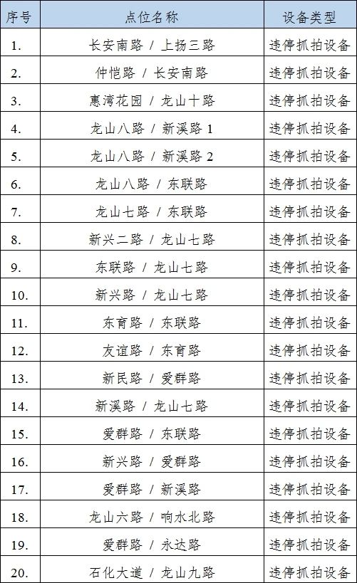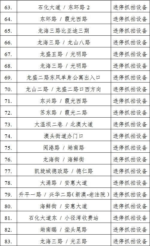 根據(jù)《中華人民共和國行政處罰法》第四十一條及《道路交通安全違法行為處理程序規(guī)定》第十六條關(guān)于“固定式交通技術(shù)監(jiān)控設(shè)備地點應(yīng)向社會公布”的規(guī)定,惠州市轄區(qū)范圍內(nèi)近期啟用的視頻監(jiān)控點位公布,具體如下: