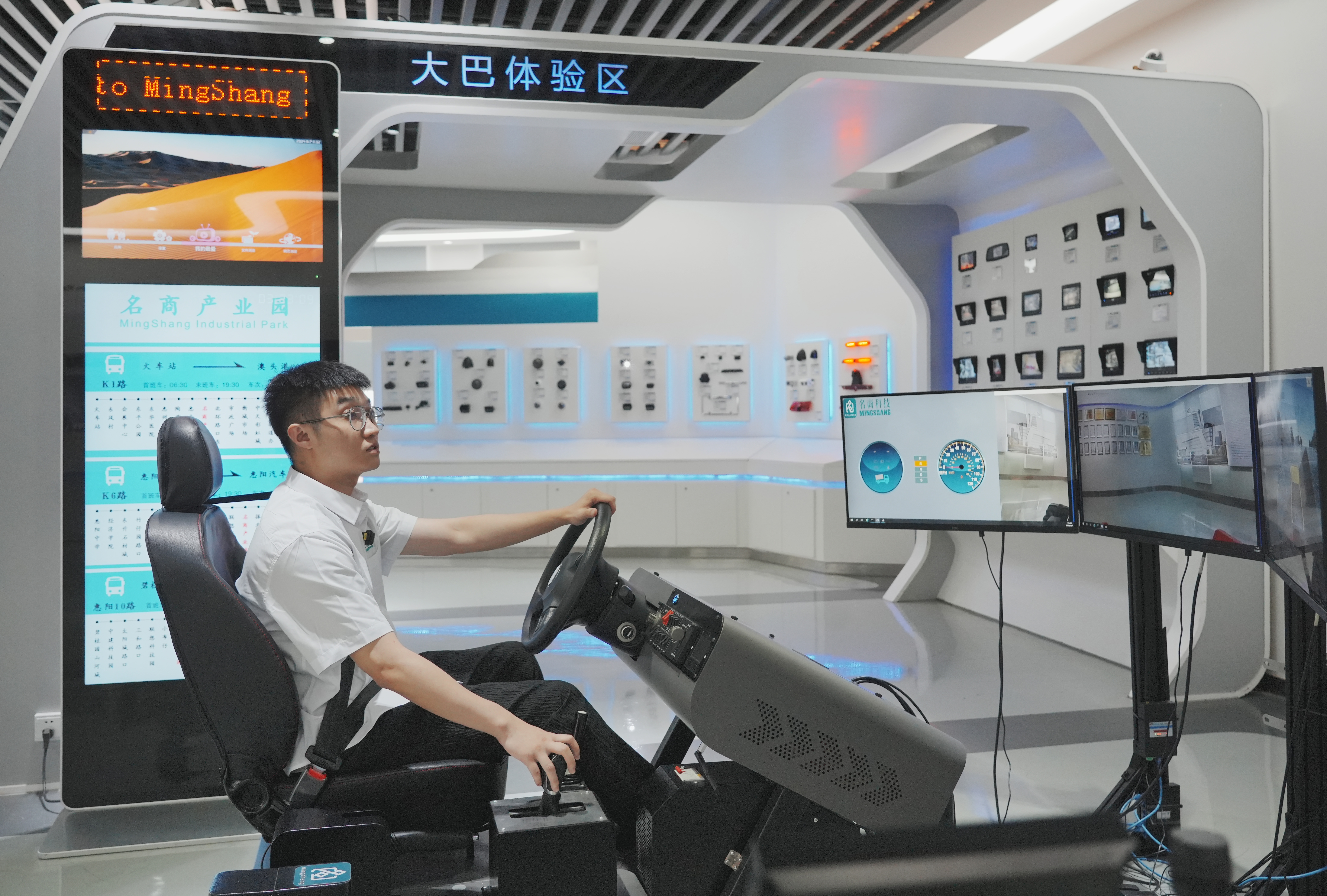 系上安全帶,調(diào)整座椅,打開(kāi)點(diǎn)火開(kāi)關(guān),啟動(dòng)車(chē)輛……所有步驟像進(jìn)入到真實(shí)駕駛室一樣,都需要按照規(guī)定流程完成。只不過(guò),駕駛員面前的不是擋風(fēng)玻璃,而是模擬器三塊顯示屏——車(chē)外環(huán)境、駕駛軌跡等一目了然。