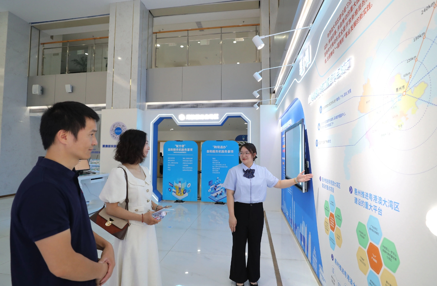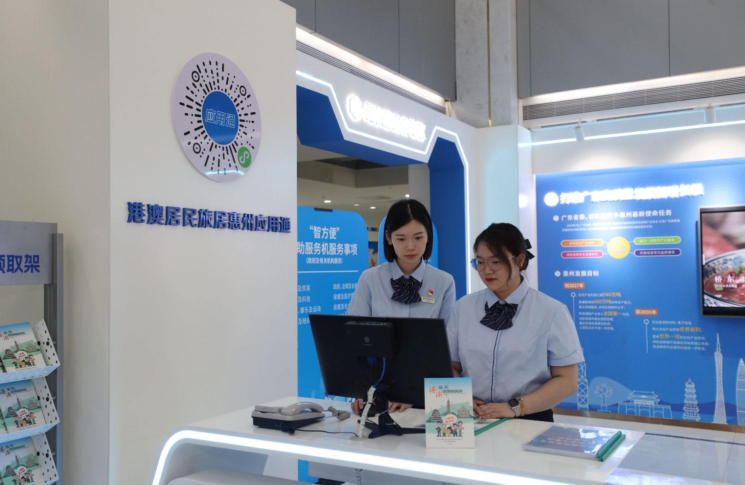 惠州市政務(wù)服務(wù)中心窗口工作人員(右一)向嘉賓介紹惠州粵港澳大灣區(qū)(港澳服務(wù))專區(qū)情況。