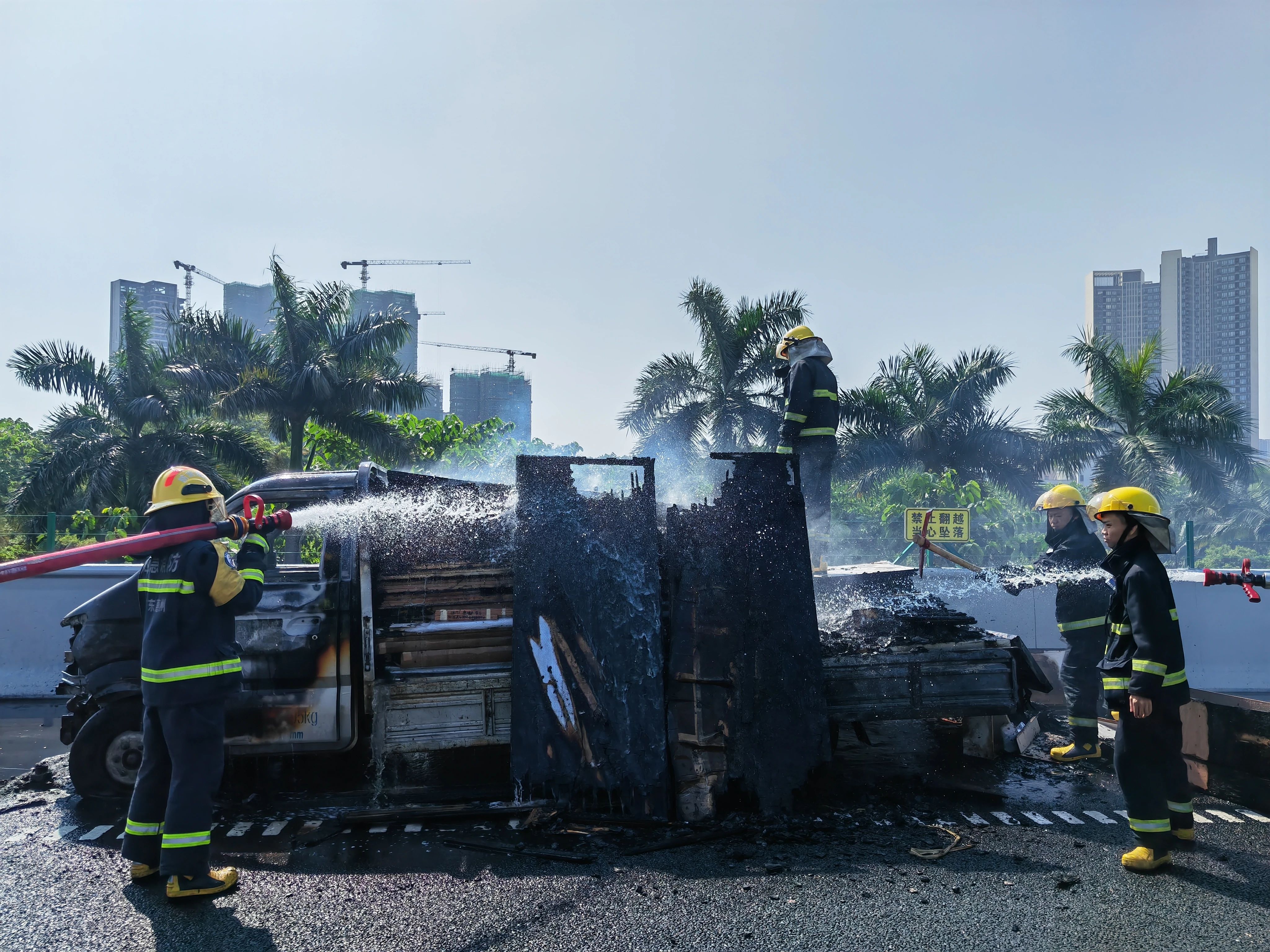 到達現(xiàn)場后,消防員立即鋪設水槍對著火車輛進行滅火降溫。明火全部撲滅后,消防利用丁字鎬將車上燃燒物品進行翻查,查看是否存在隱患,并進行隱火消除工作,防止再次引發(fā)火災。
