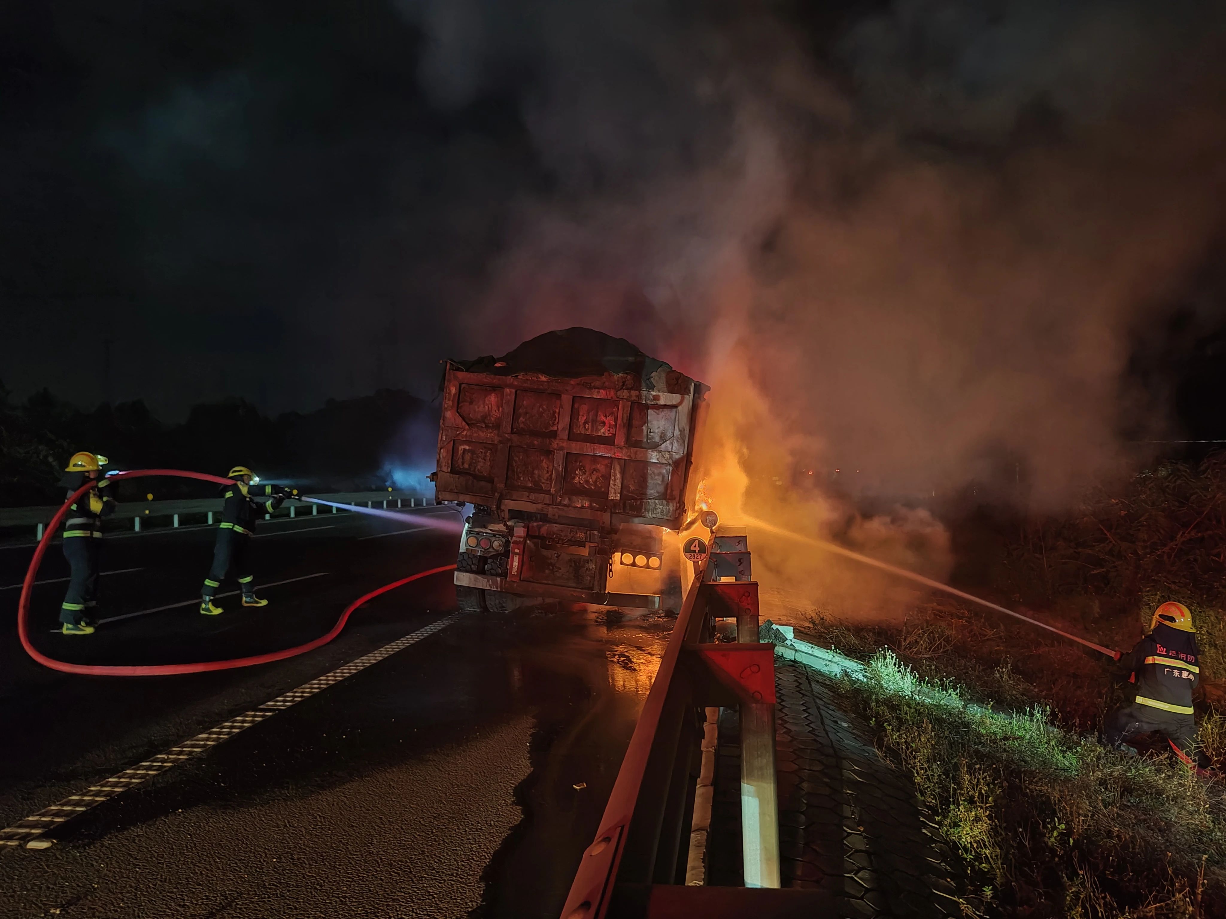 消防救援人員到達現(xiàn)場后經(jīng)勘查發(fā)現(xiàn),事故車輛上一輛裝載泥土的貨車,著火部位為貨車的右后輪胎。指揮員派出警示人員在車輛后方路段設置警戒區(qū),隨后出水槍對著火部位進行滅火降溫,很快明火被撲滅。