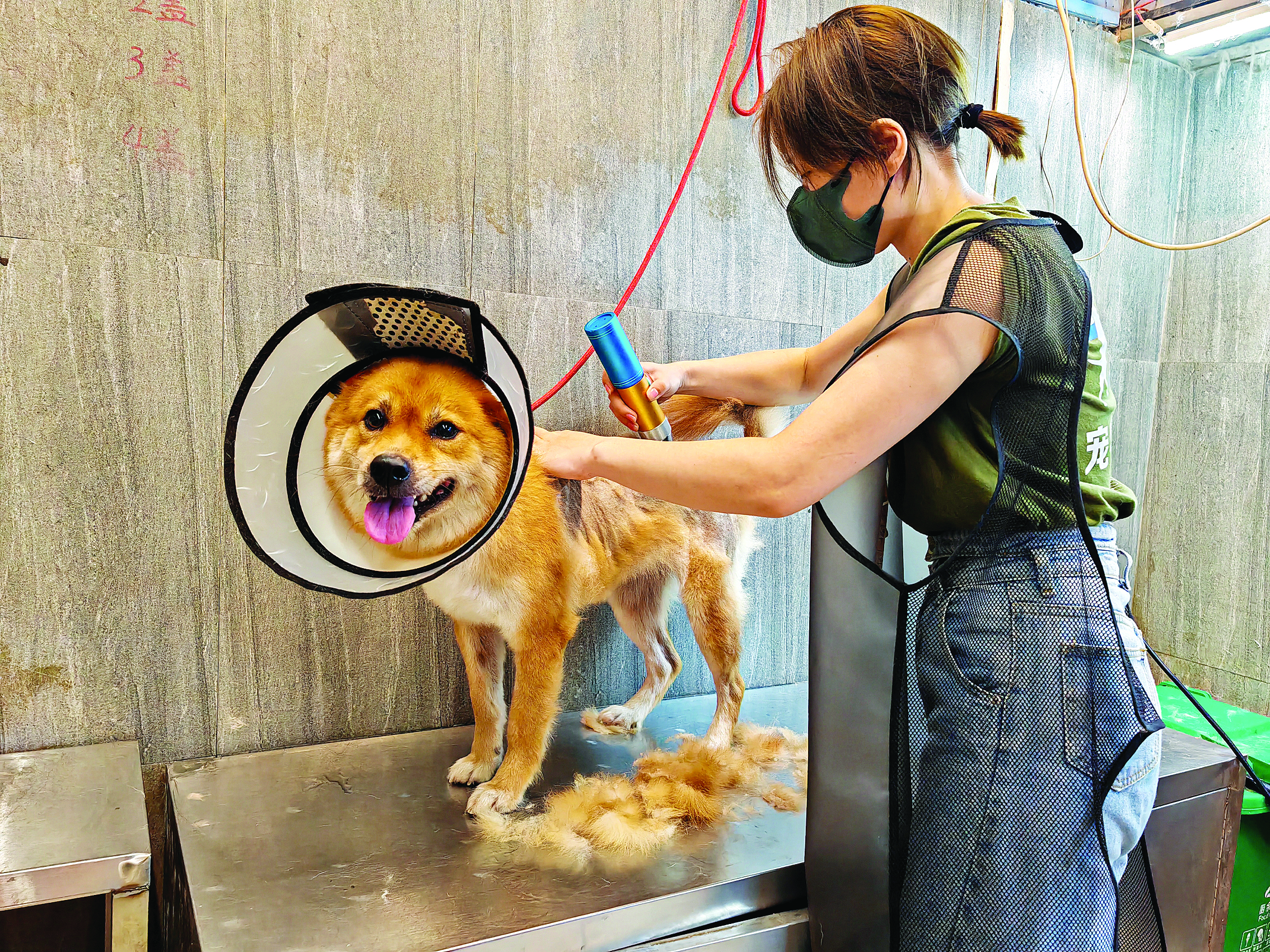 從業(yè)人員在給寵物進行洗護、剃毛。