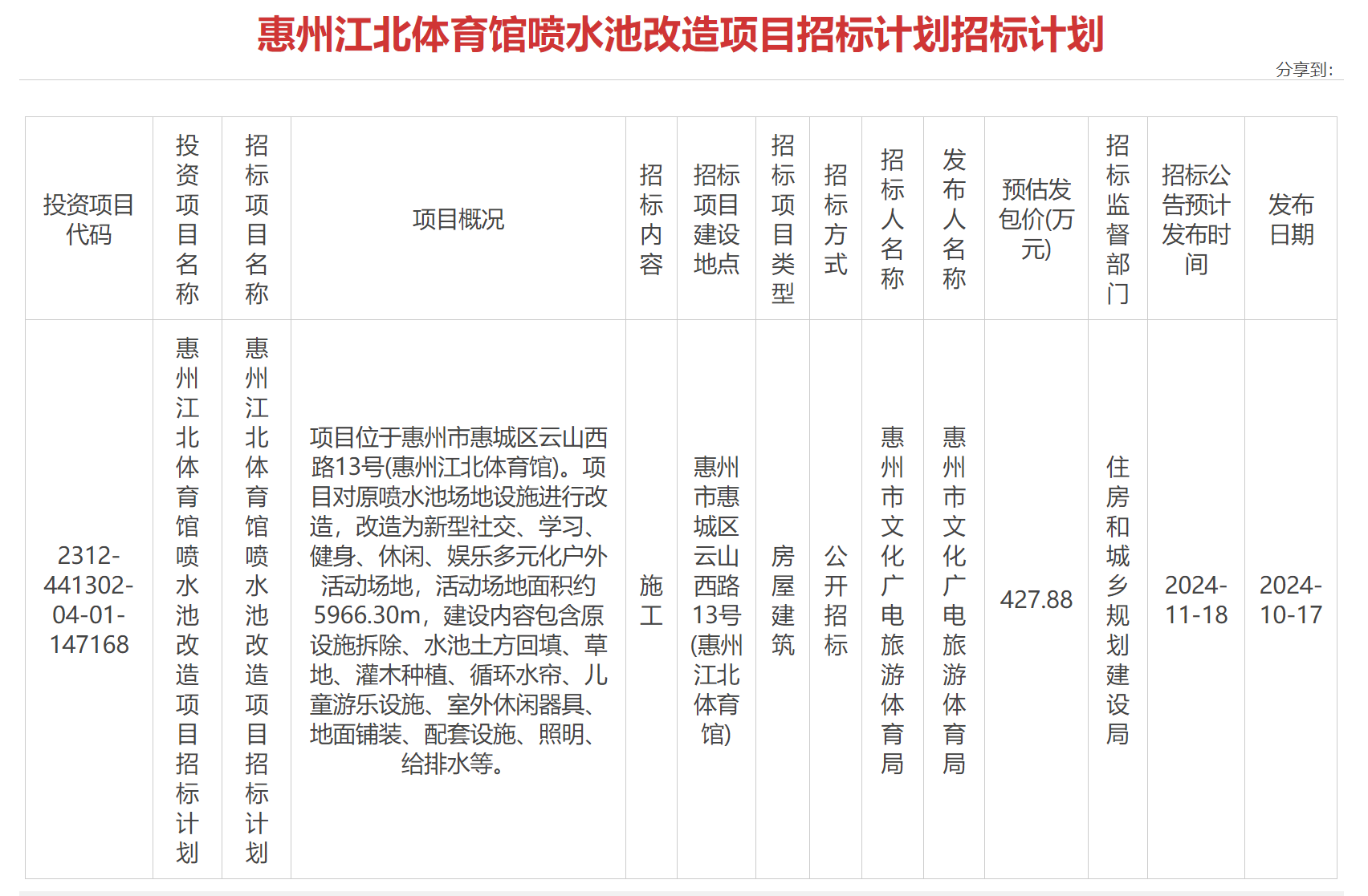 招標(biāo)計劃文件顯示,項目位于惠州市惠城區(qū)云山西路13號(惠州江北體育館)。