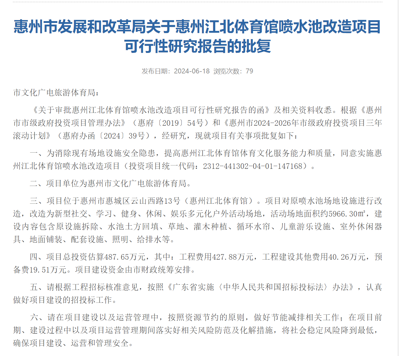 實(shí)際上在今年6月份,惠州市發(fā)展和改革局就發(fā)布《關(guān)于惠州江北體育館噴水池改造項目可行性研究報告的批復(fù)》。