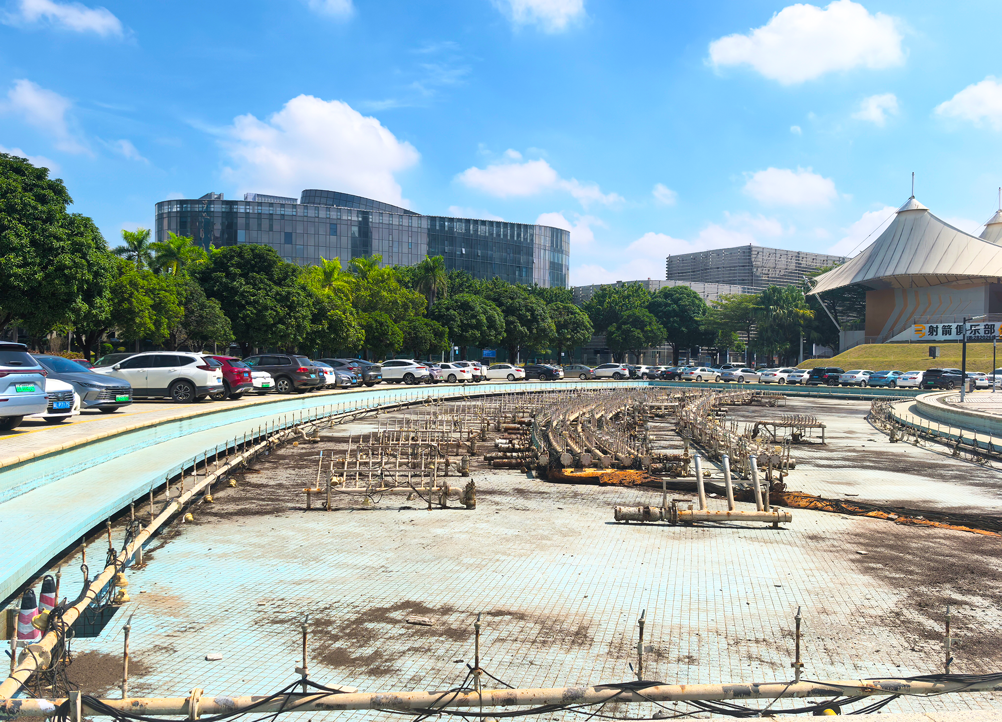 時光流轉(zhuǎn),噴水池早已不復(fù)當(dāng)年模樣,設(shè)備老化,銹跡斑斑,池底更是一滴水也沒有,可見噴泉已經(jīng)很久沒有使用了。