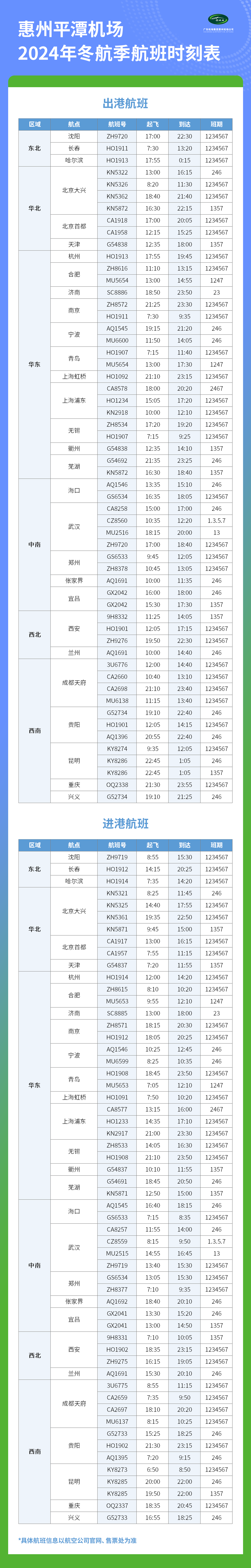 惠州平潭機(jī)場(chǎng)2024年冬春航季航班時(shí)刻表
