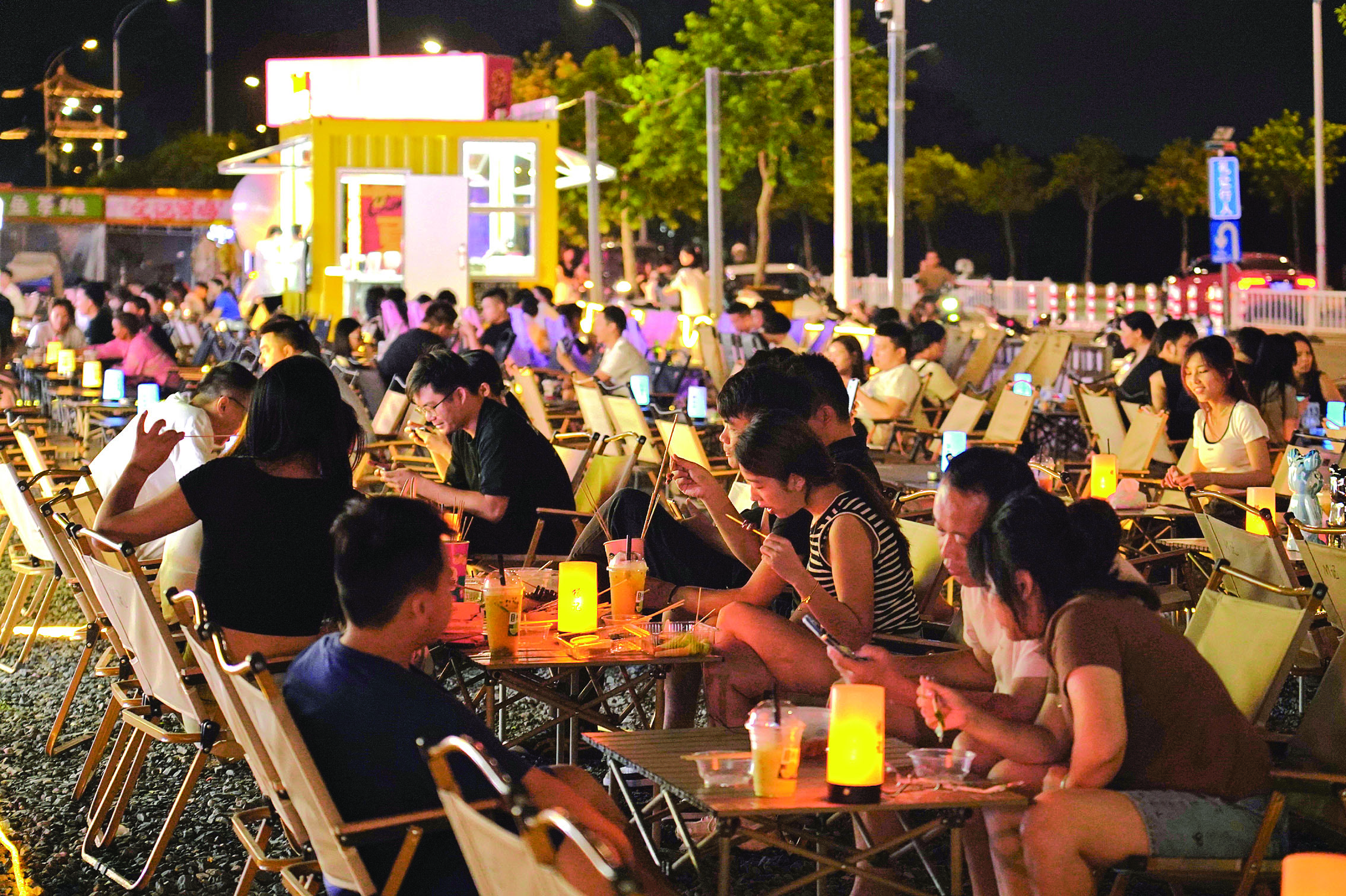 晚上9時(shí),花里頭潮聚公園迎來客流高峰,在車水馬龍的城市中,這里別有一番風(fēng)味:10米高的卡通充氣模型、五顏六色的集裝箱、擺滿廣場的露營折疊座椅、抱著吉他的駐場歌手、童年記憶里的露天影院……